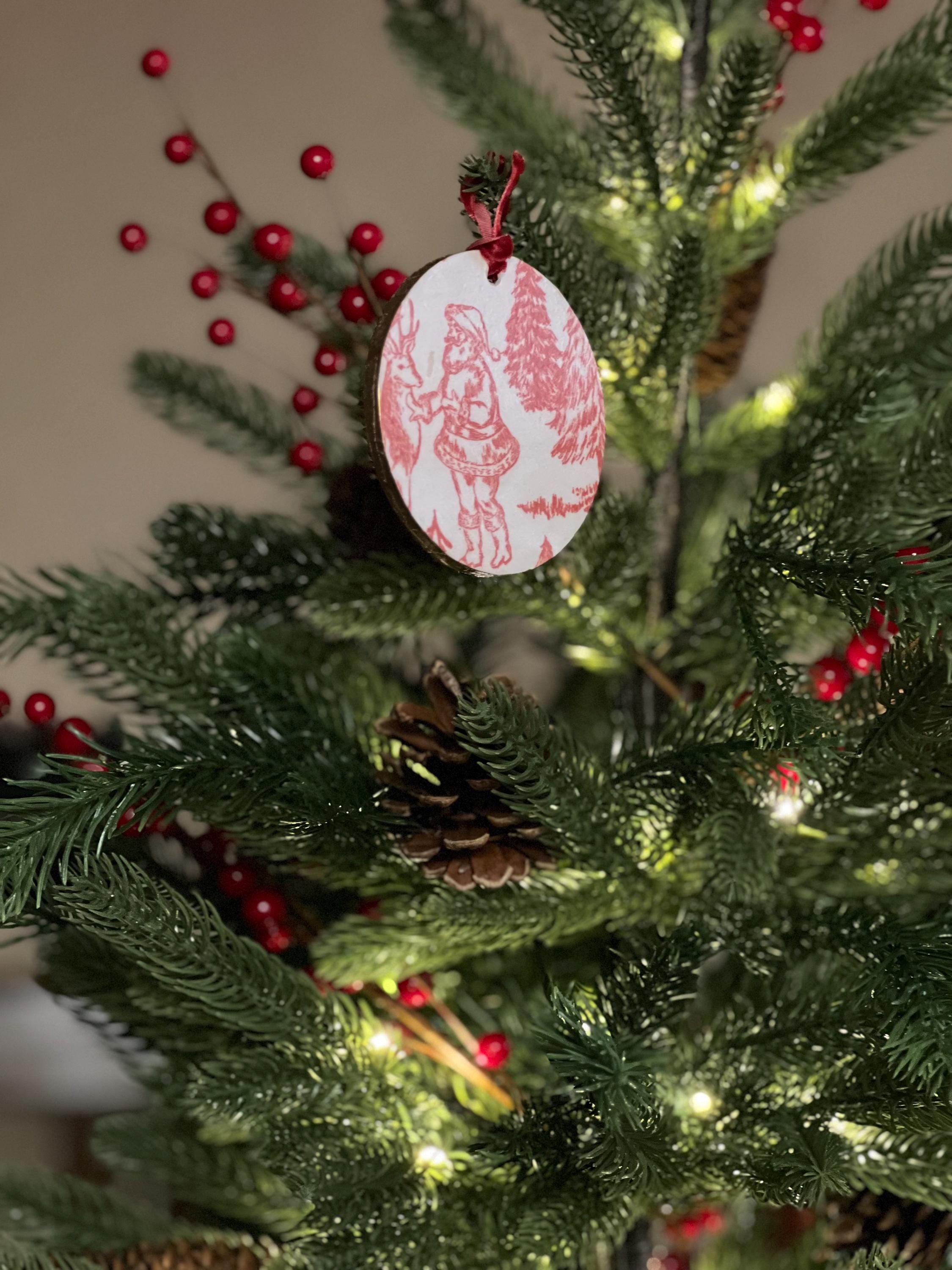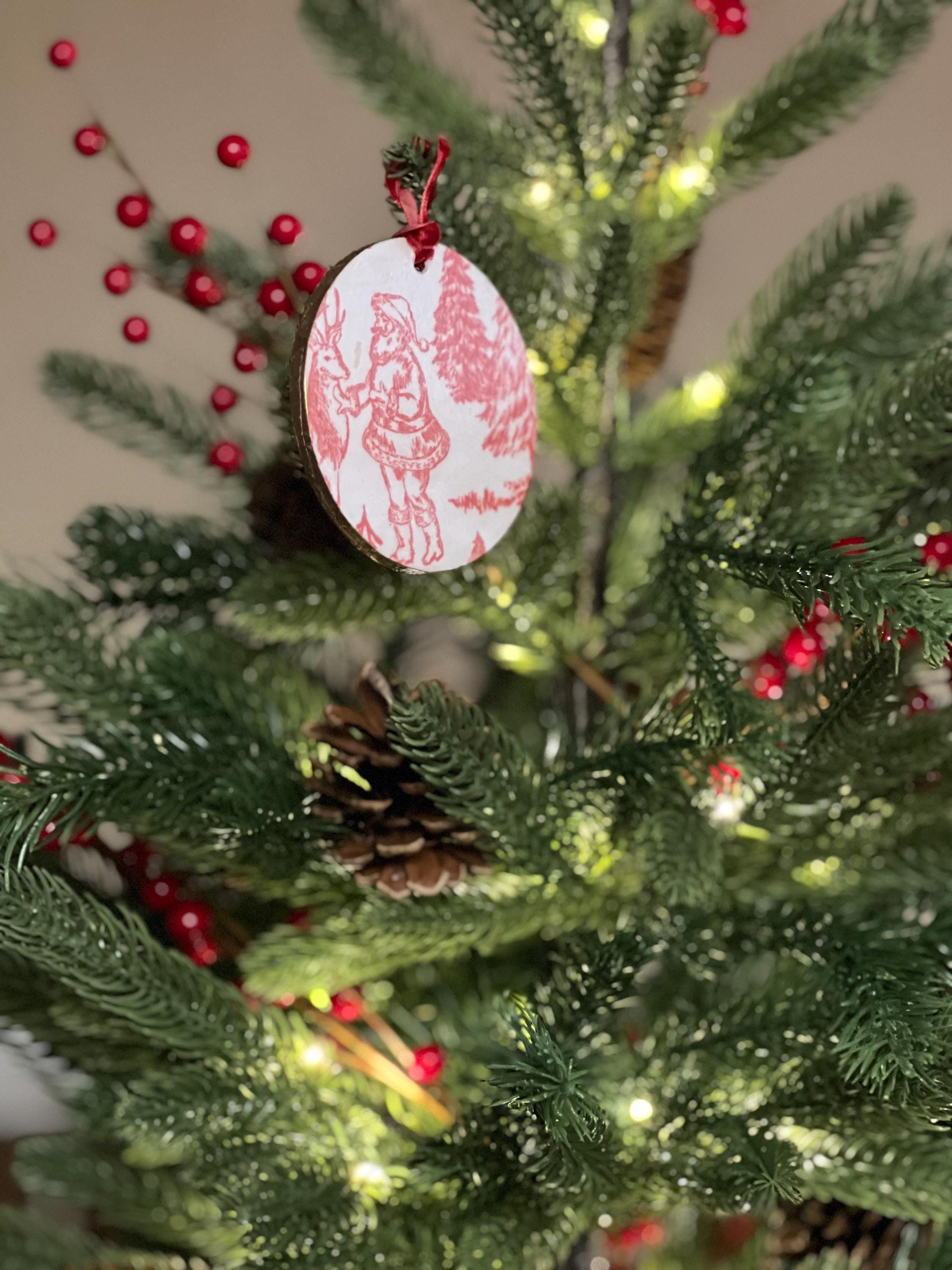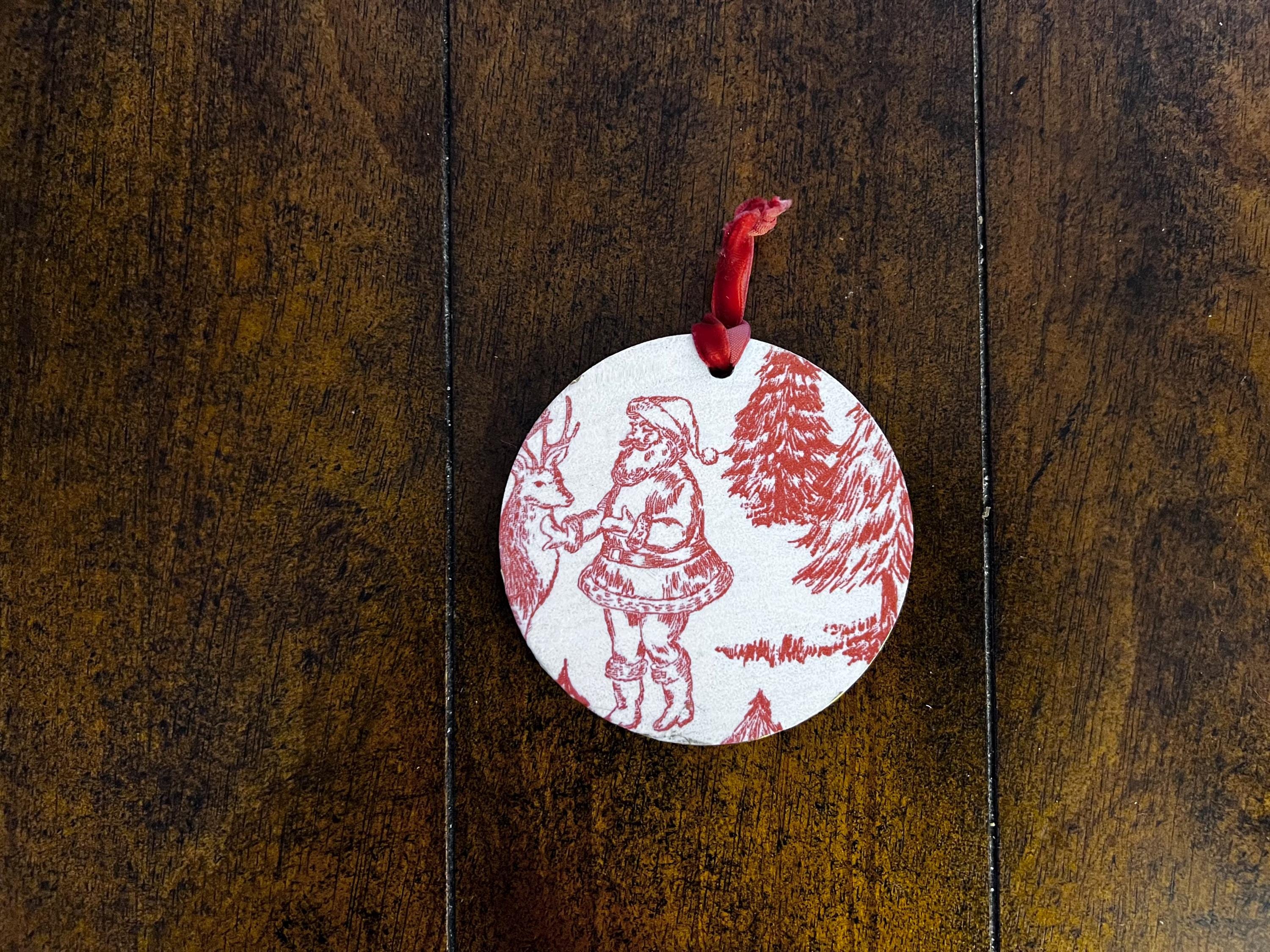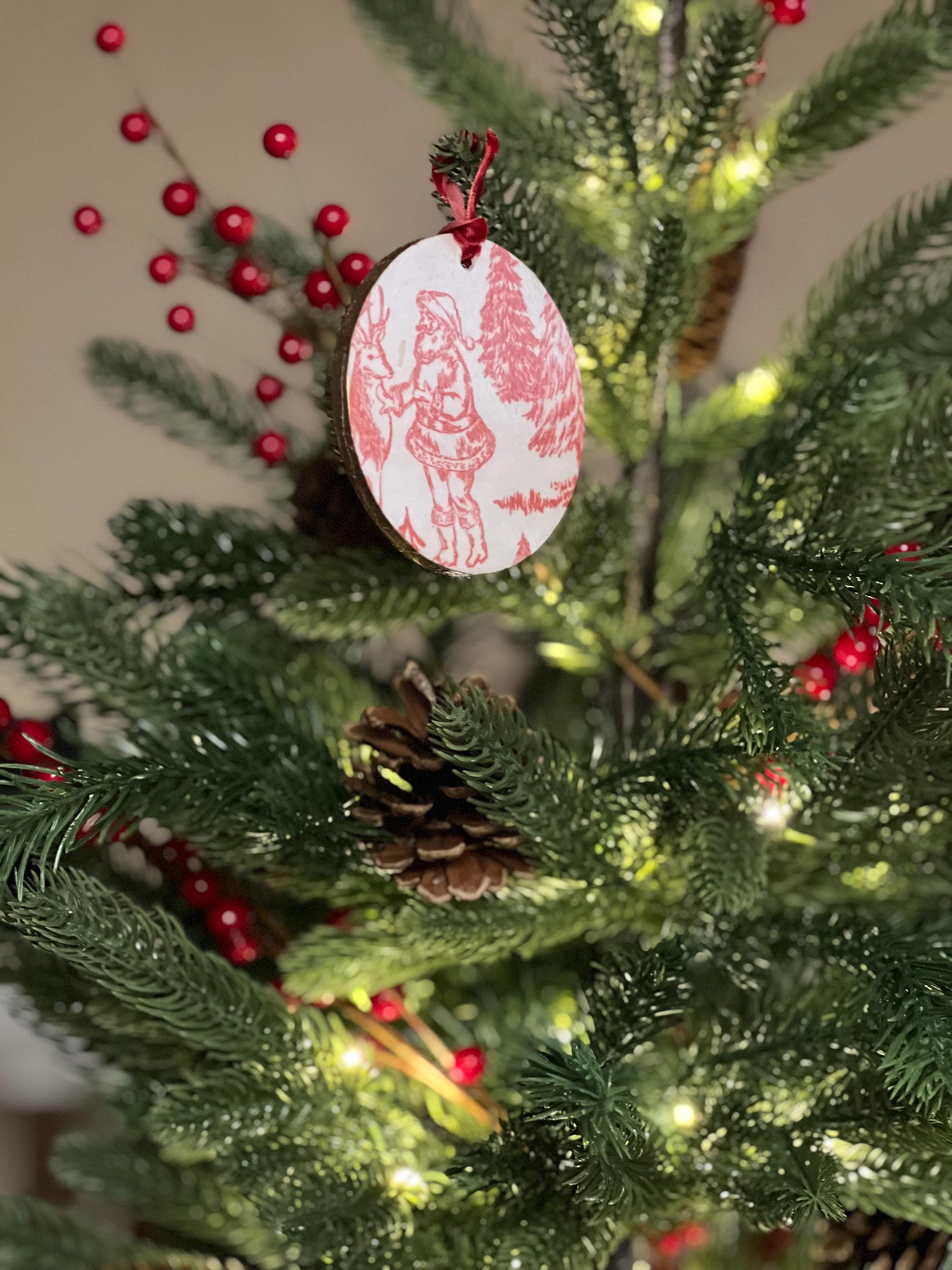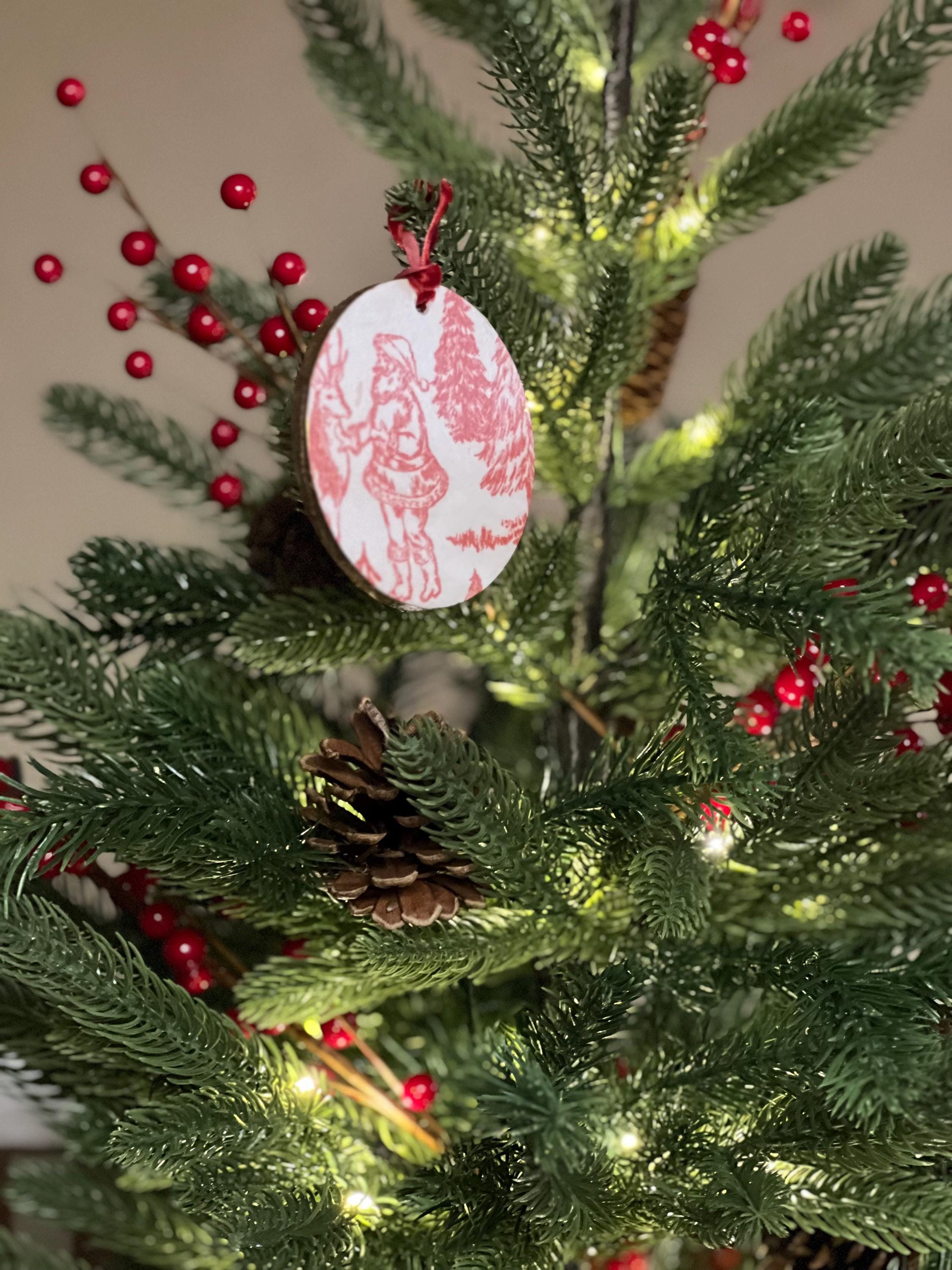 Features Red toile-style woodland animal design Round ornament with smooth matte finish Rustic ribbon for easy hanging Lightweight + durable Perfect for farmhouse, vintage, cottagecore, or French country holiday décor
