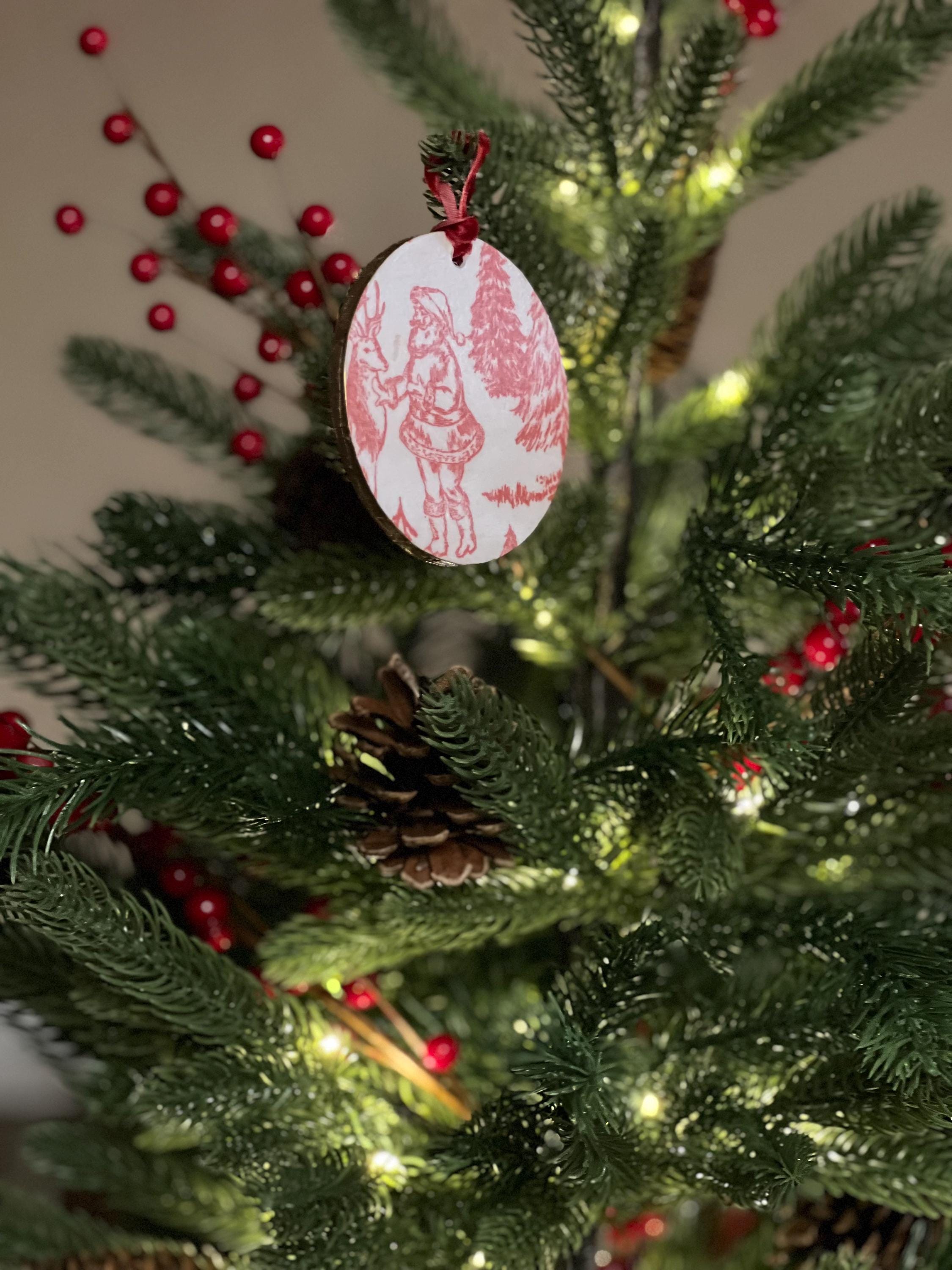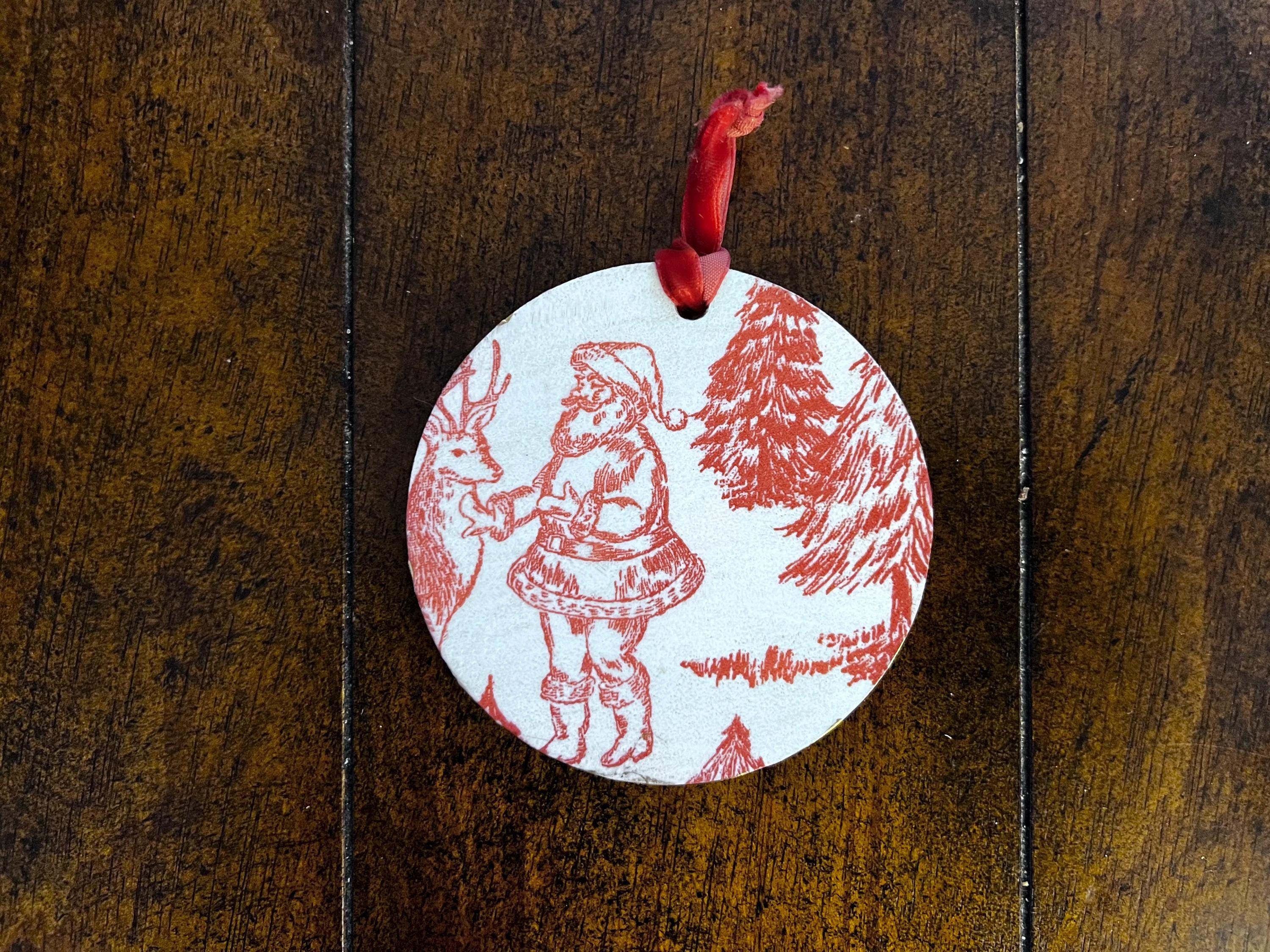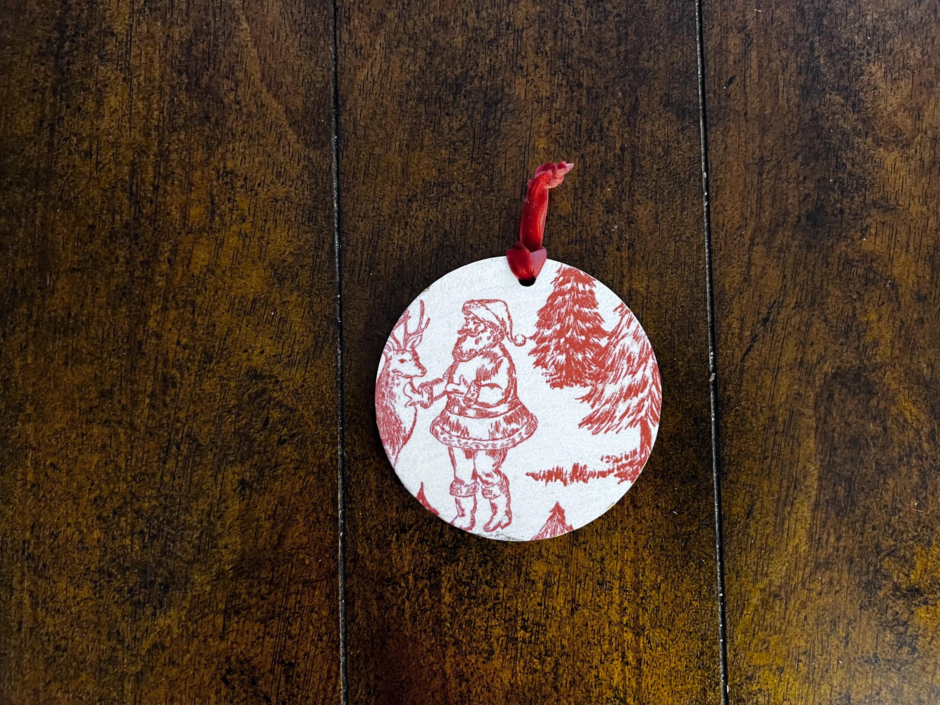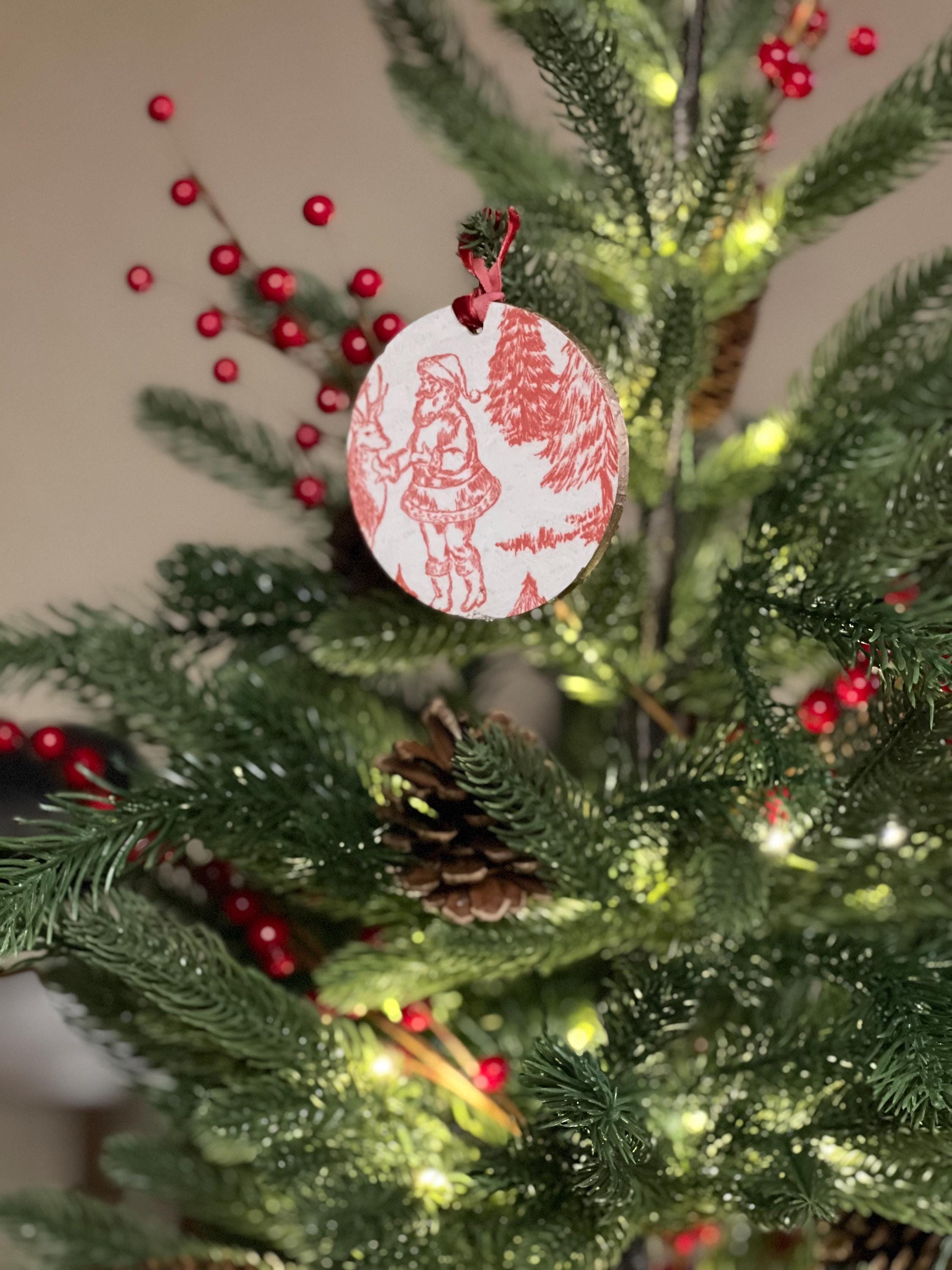 Features Red toile-style woodland animal design Round ornament with smooth matte finish Rustic ribbon for easy hanging Lightweight + durable Perfect for farmhouse, vintage, cottagecore, or French country holiday décor