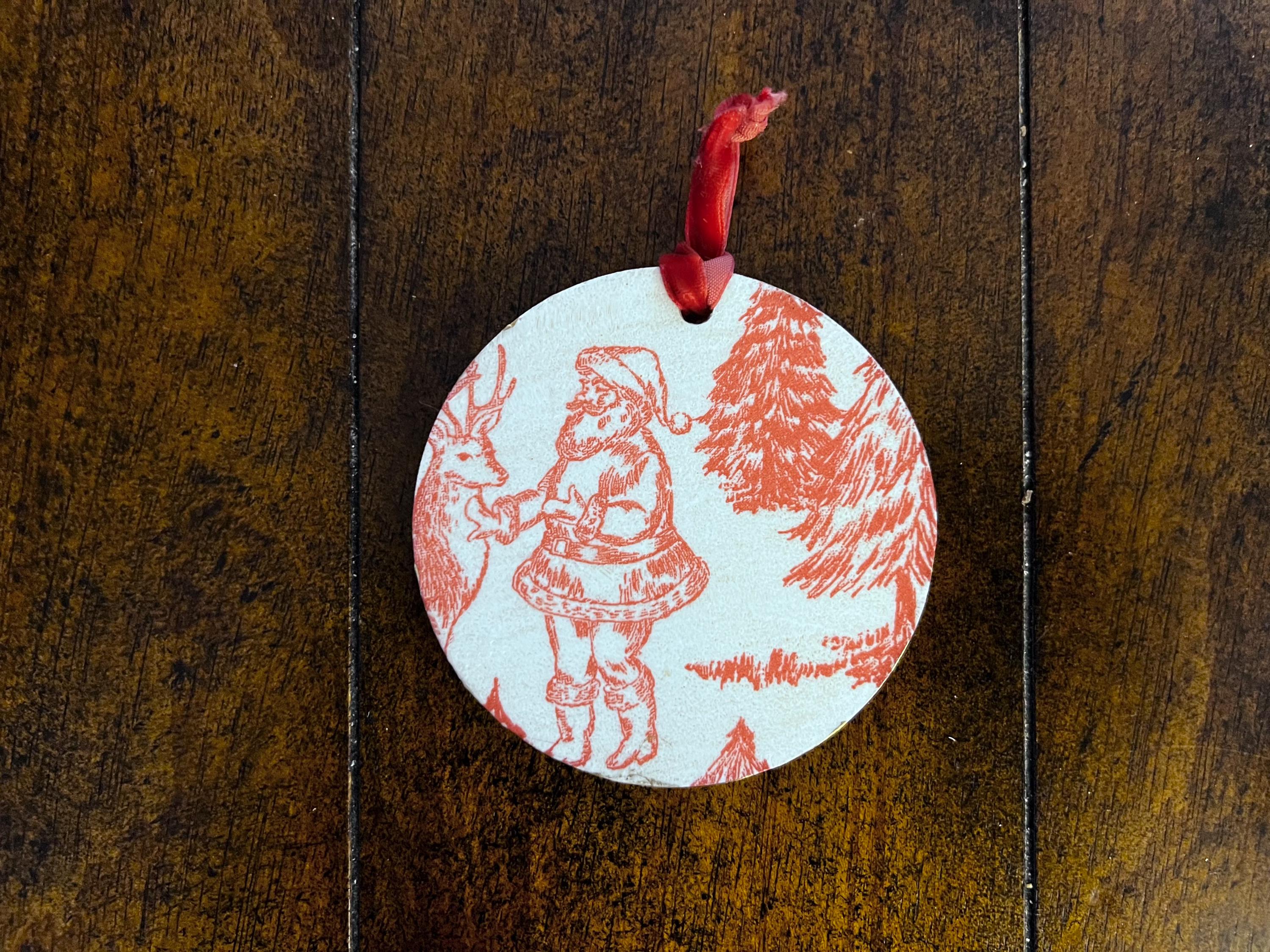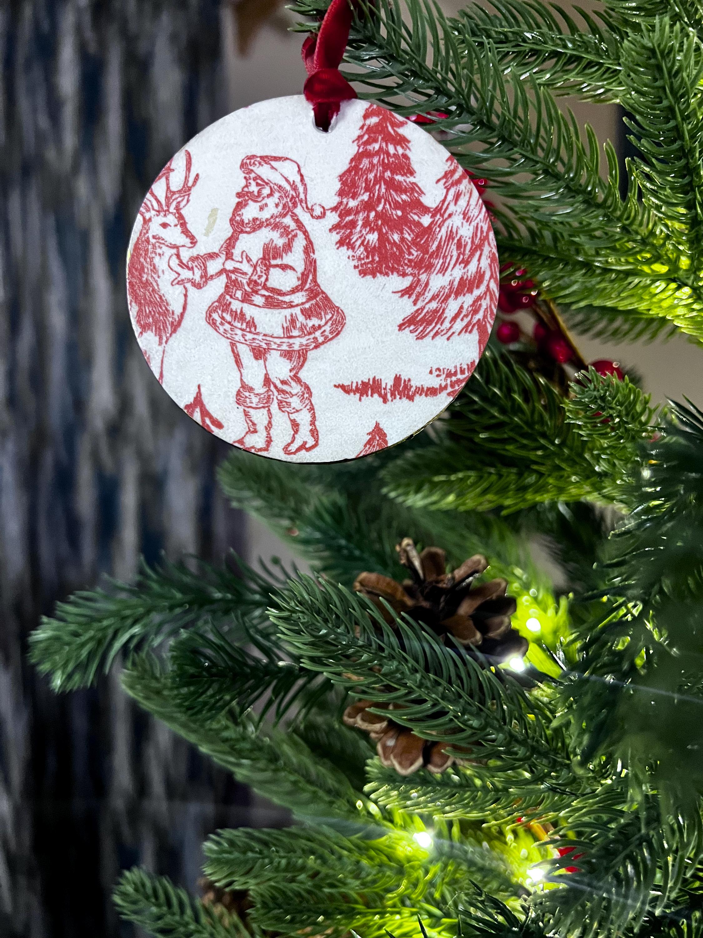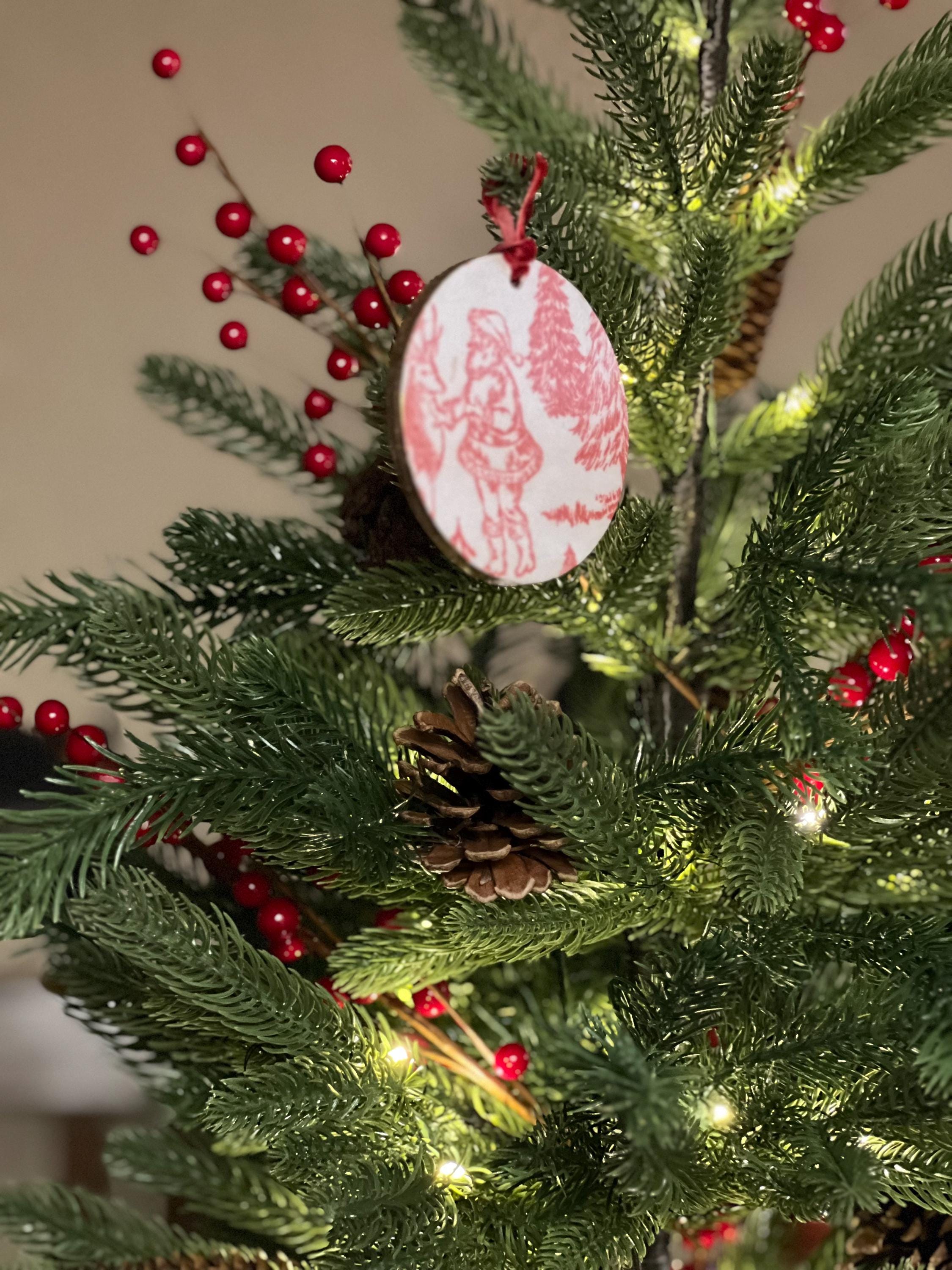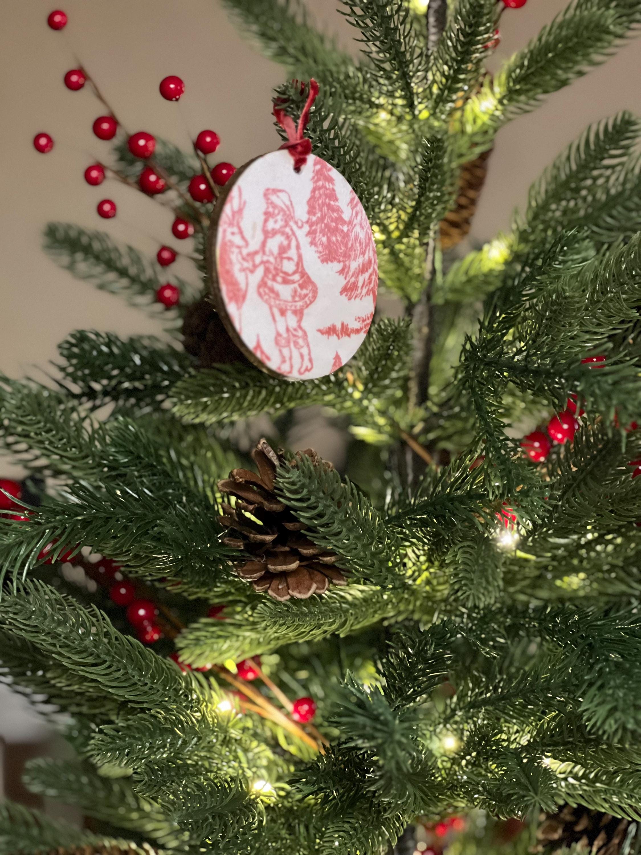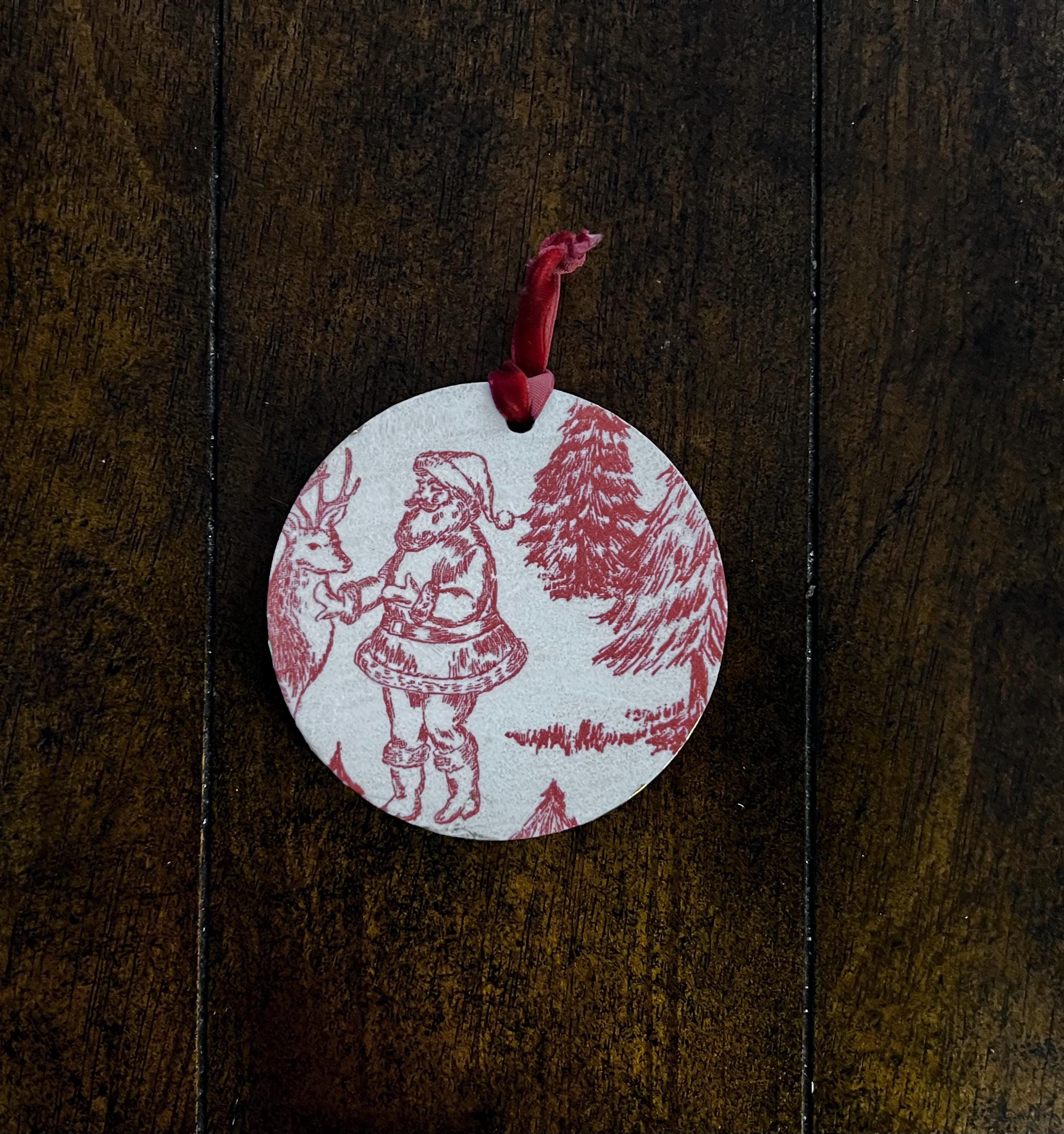 Features Red toile-style woodland animal design Round ornament with smooth matte finish Rustic ribbon for easy hanging Lightweight + durable Perfect for farmhouse, vintage, cottagecore, or French country holiday décor