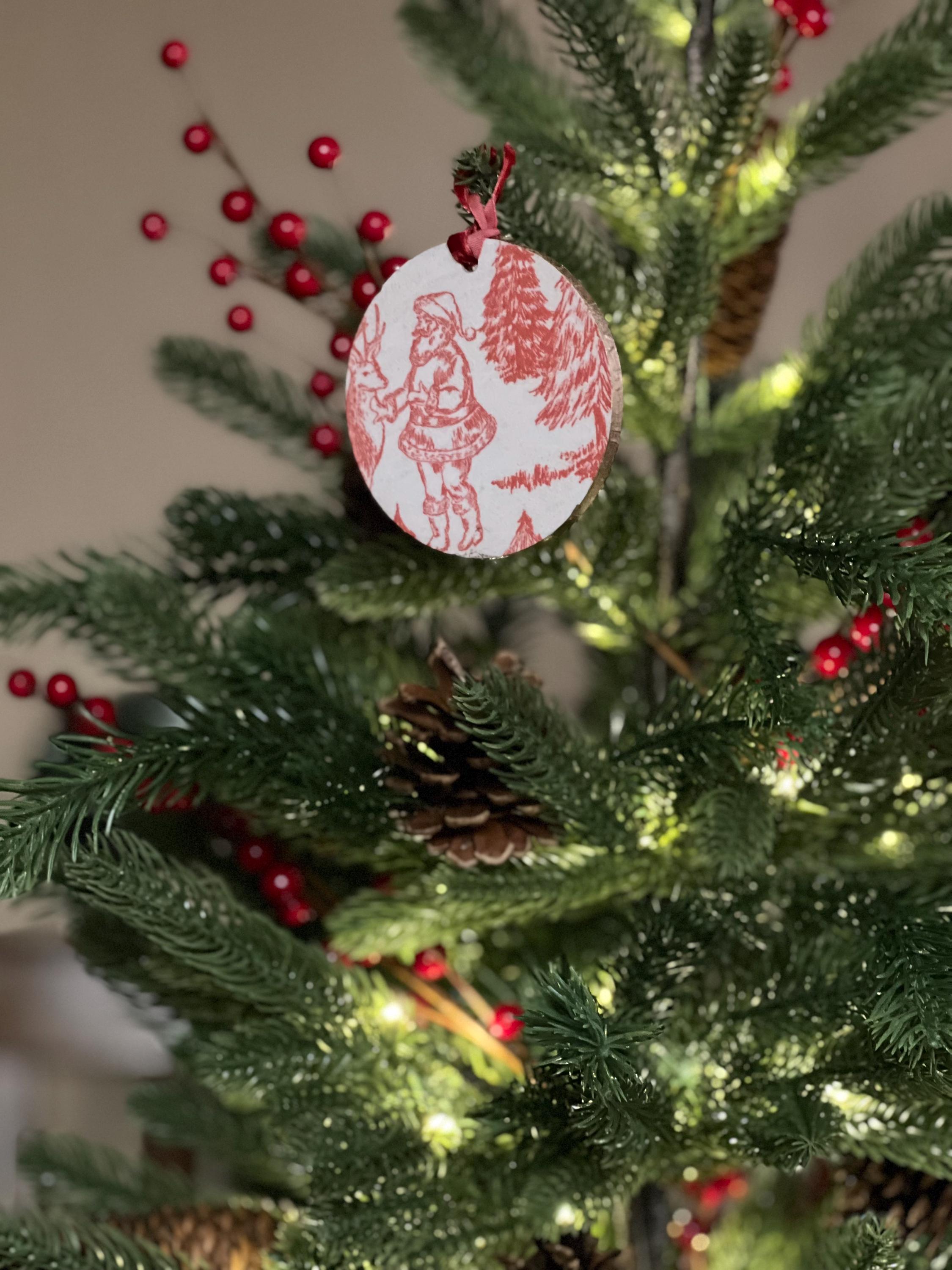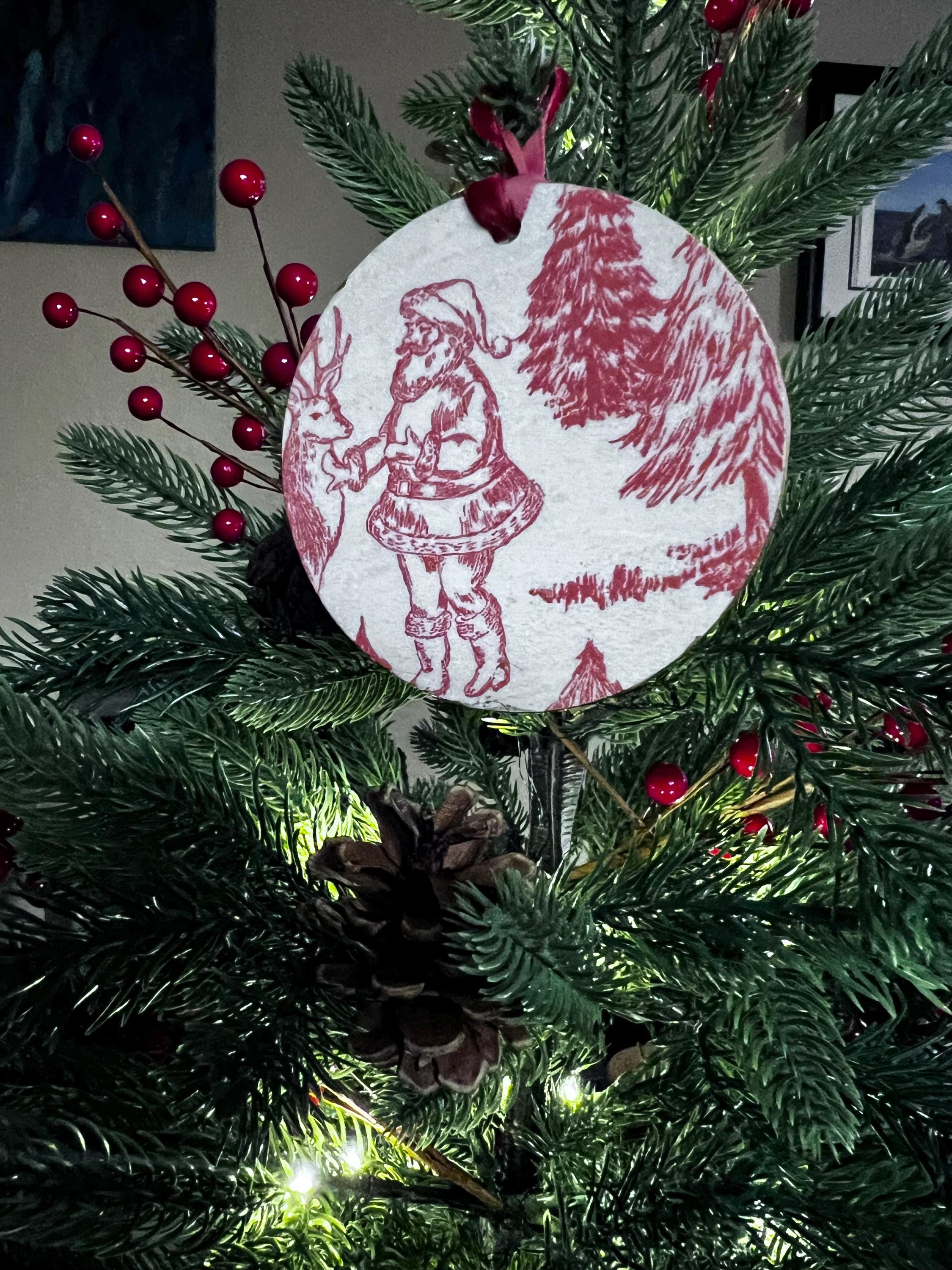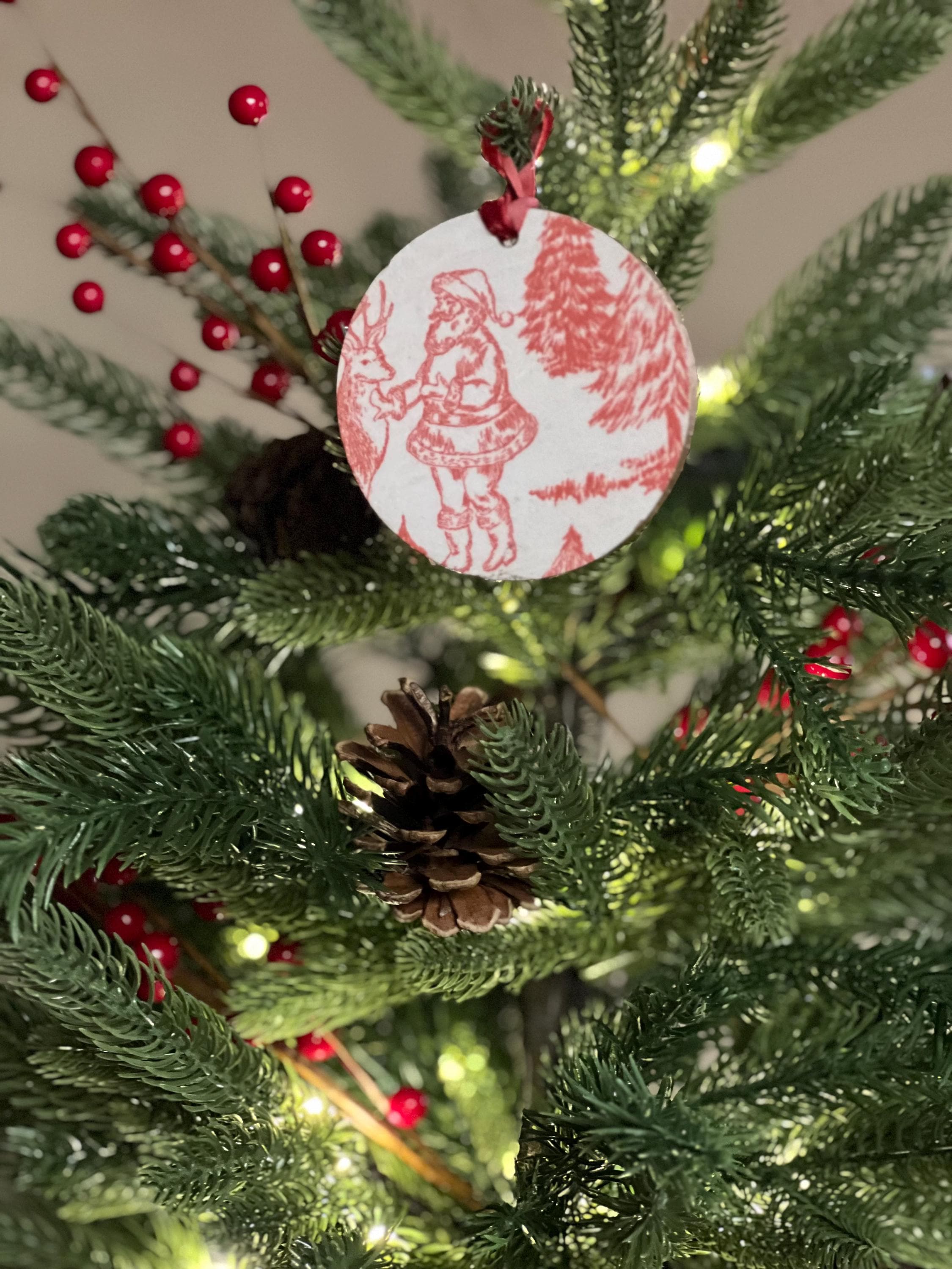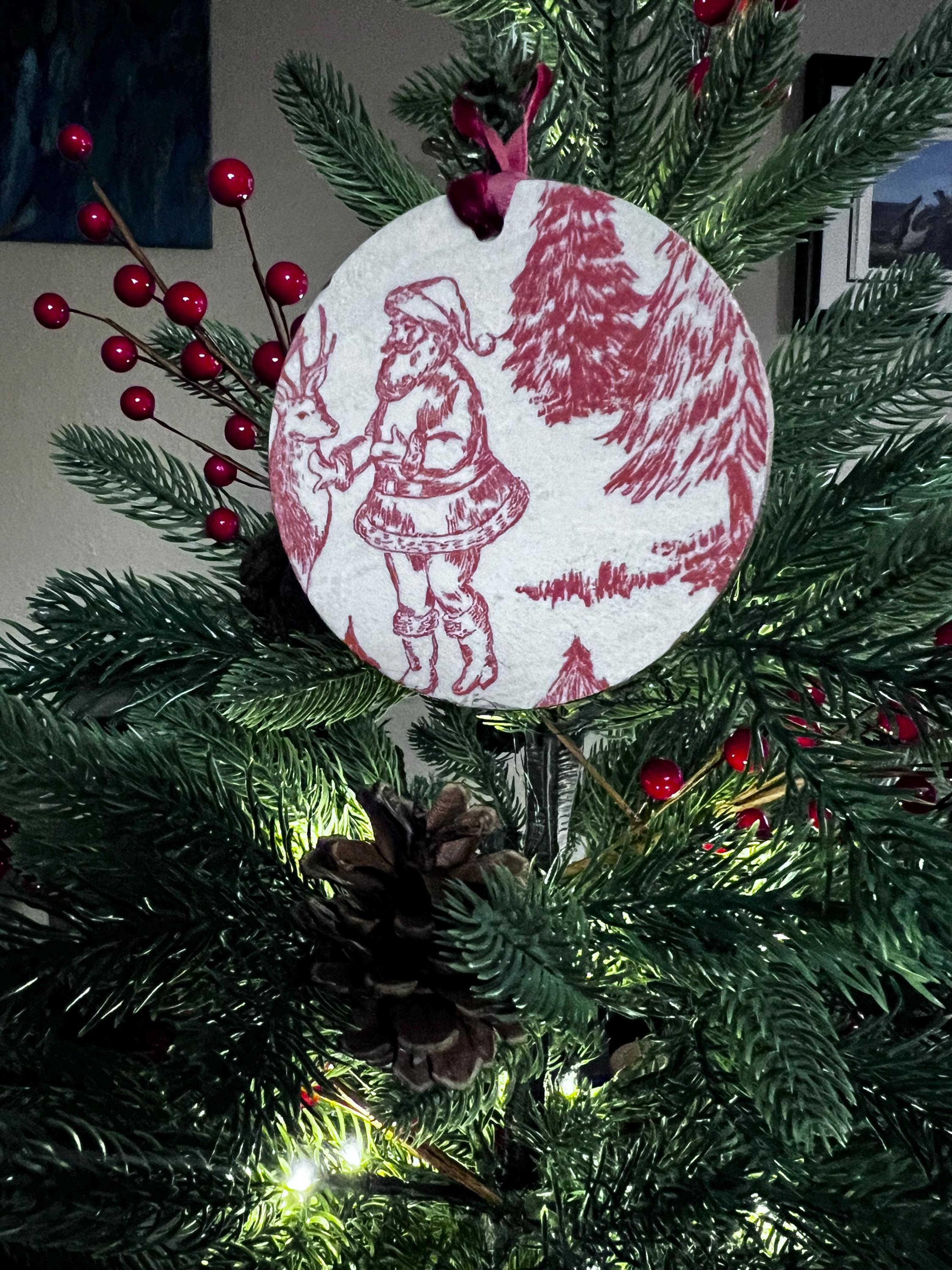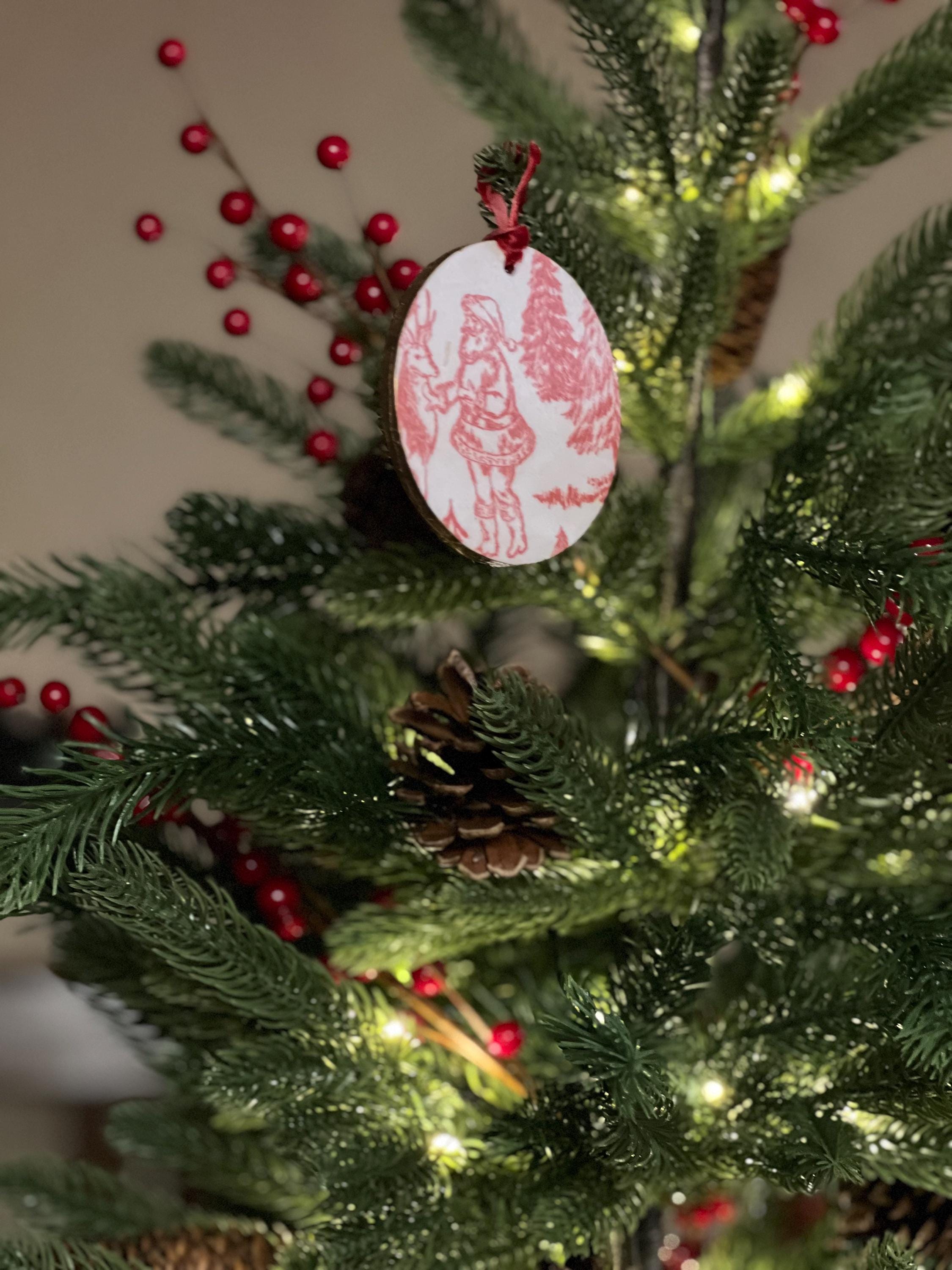 Features Red toile-style woodland animal design Round ornament with smooth matte finish Rustic ribbon for easy hanging Lightweight + durable Perfect for farmhouse, vintage, cottagecore, or French country holiday décor