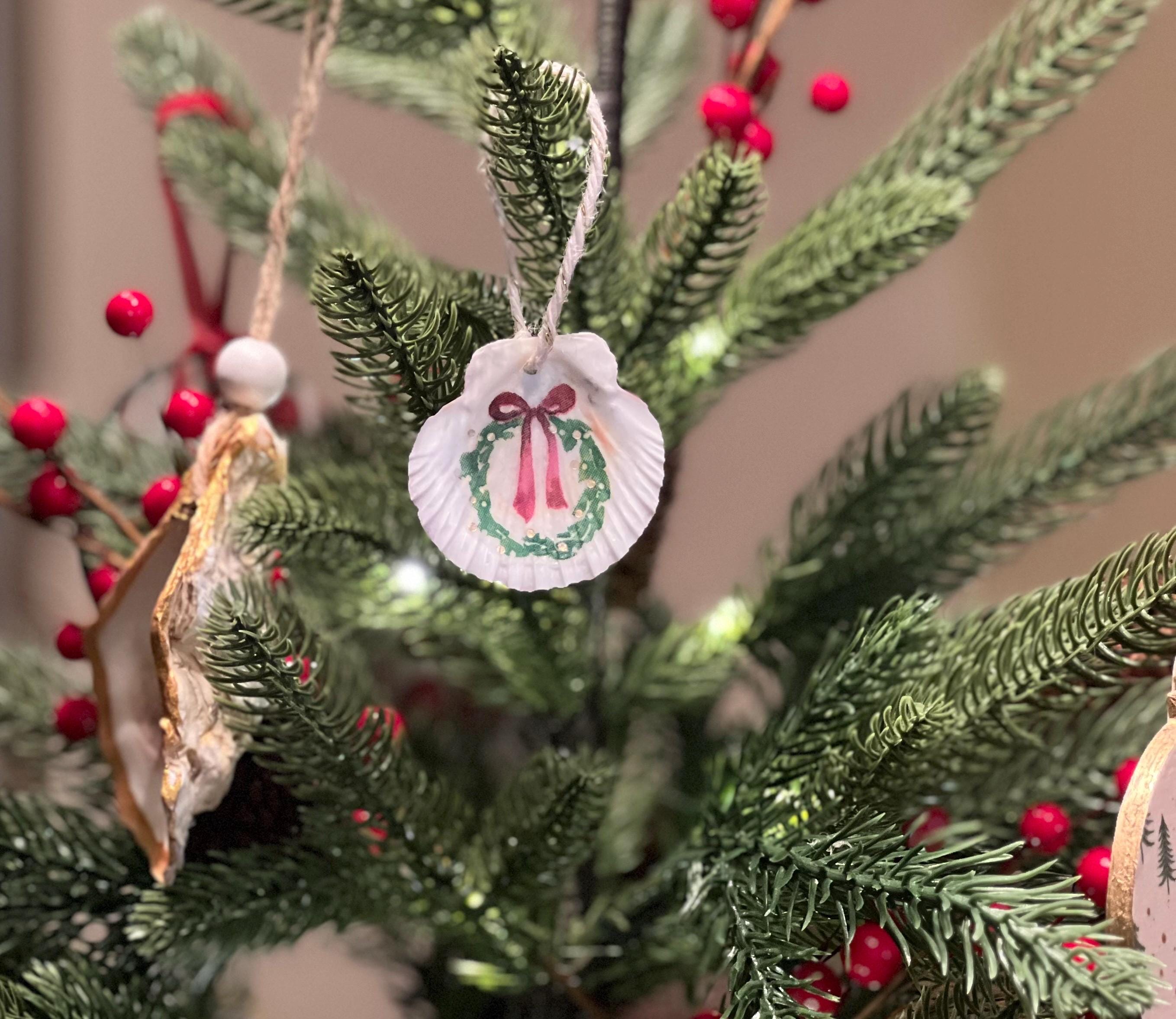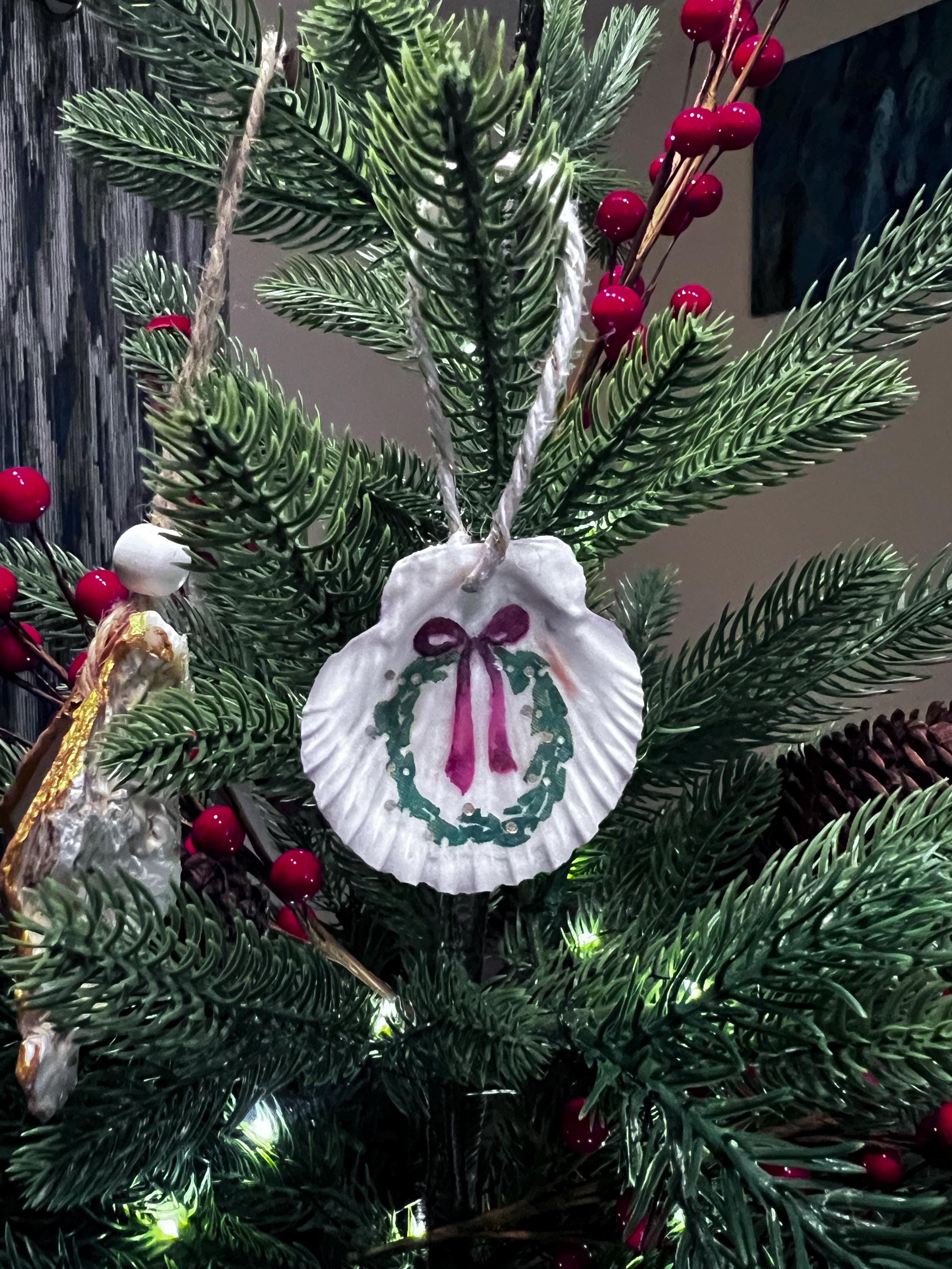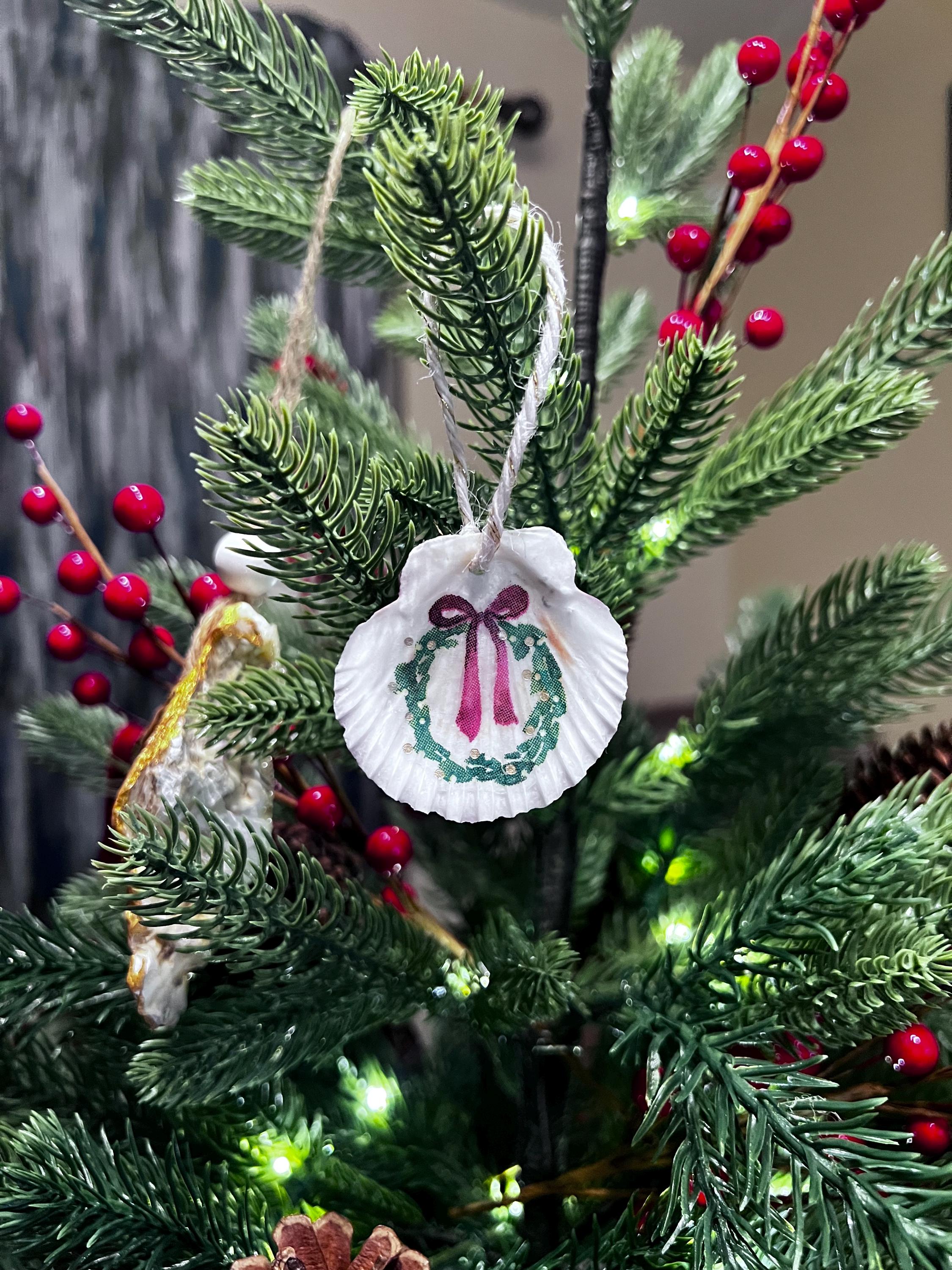 Features • Real scallop sea shell (approx. 1.5”) • Decoupaged wreath design inside the shell • Natural scalloped texture and purple exterior • Jute hanging loop with gold accent • Coastal, nautical, and cottage holiday aesthetic • Ultra lightweight — only 1/8 oz • Handmade & one-of-a-kind