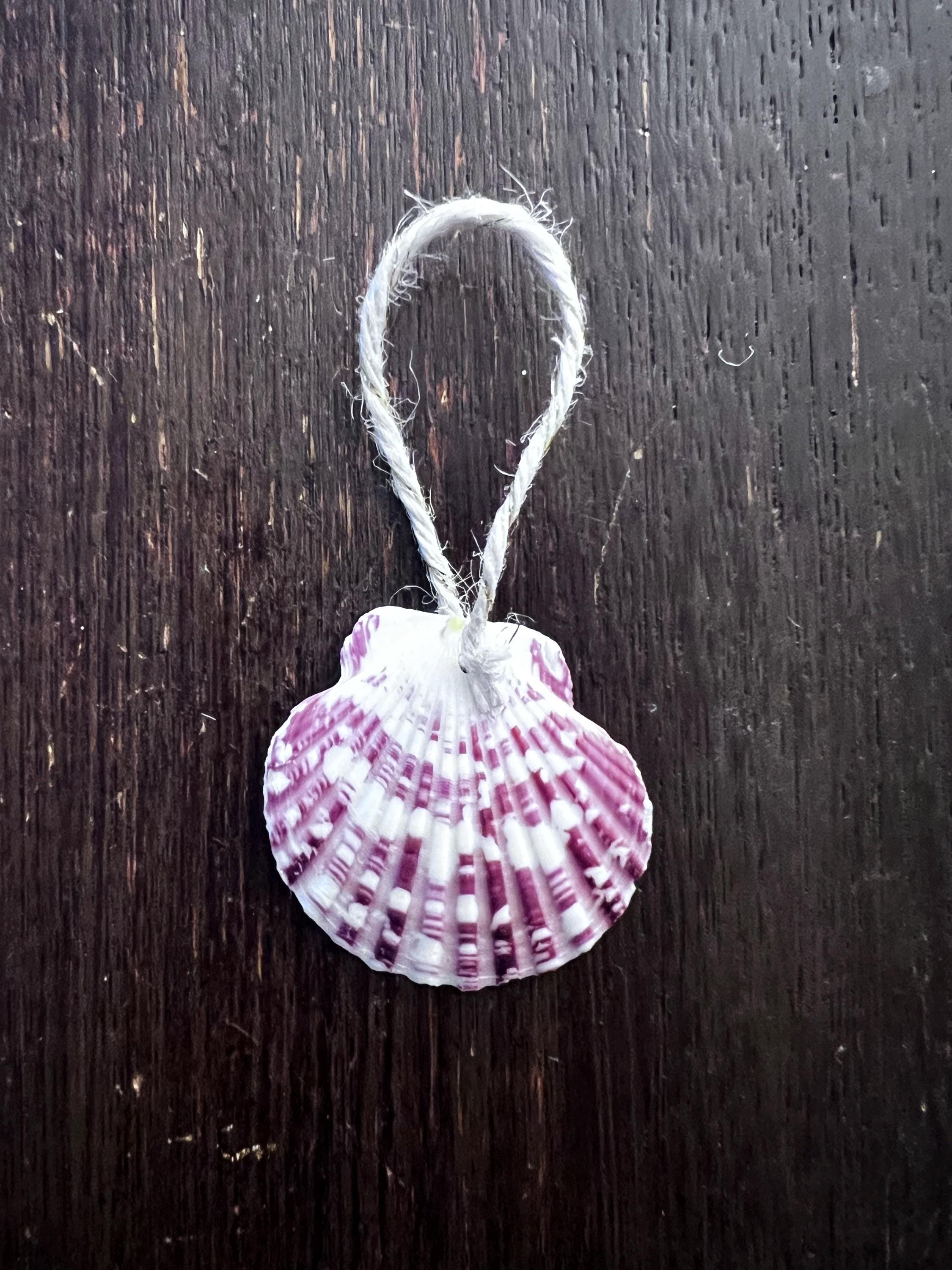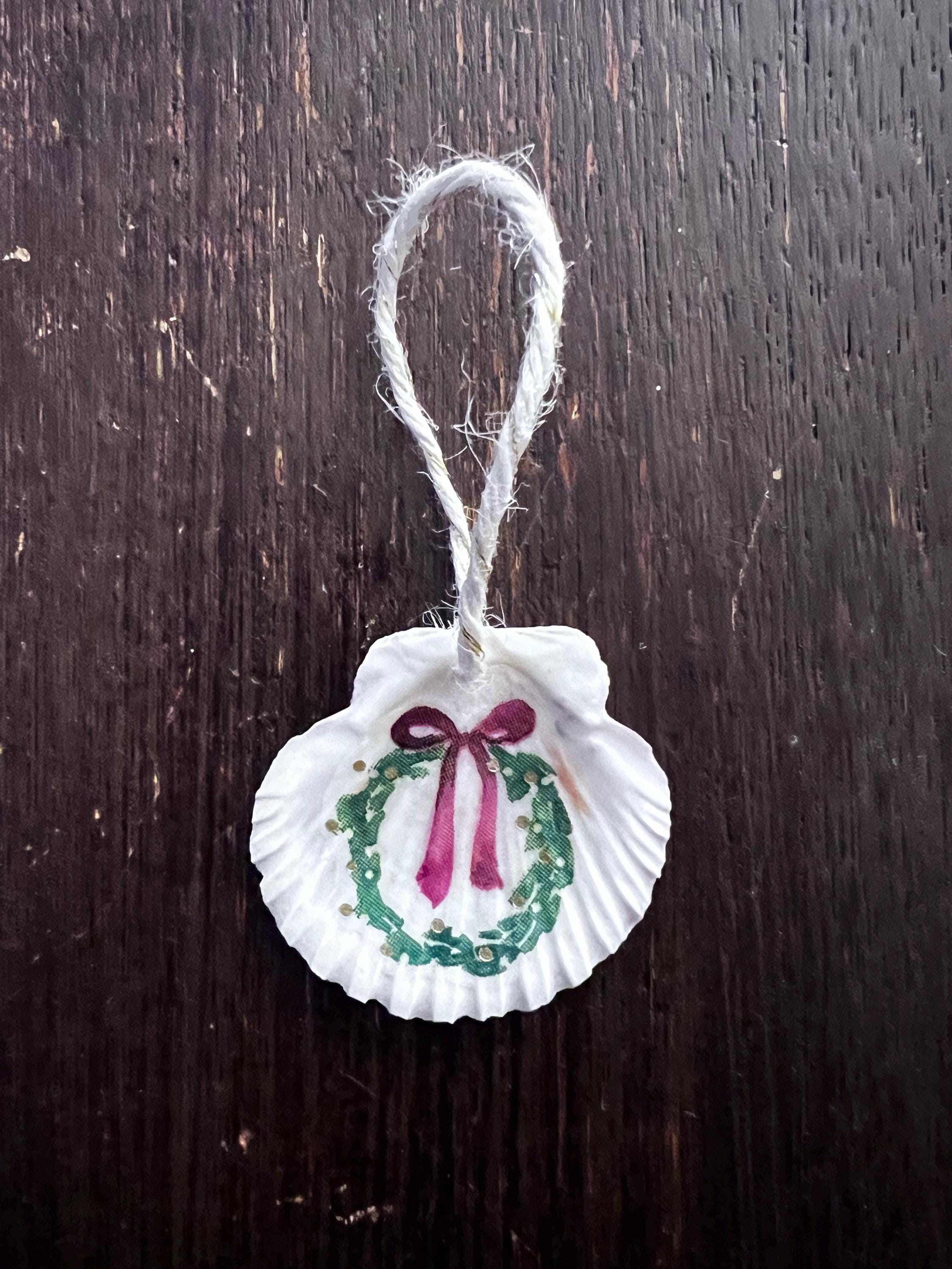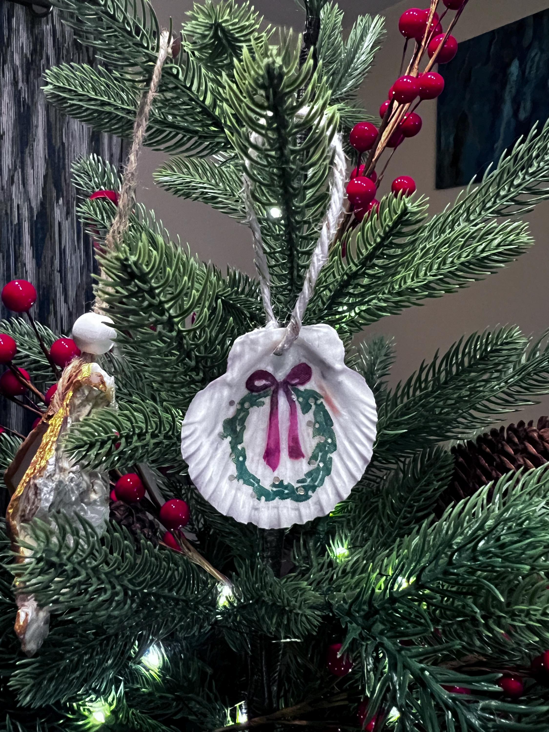 Features • Real scallop sea shell (approx. 1.5”) • Decoupaged wreath design inside the shell • Natural scalloped texture and purple exterior • Jute hanging loop with gold accent • Coastal, nautical, and cottage holiday aesthetic • Ultra lightweight — only 1/8 oz • Handmade & one-of-a-kind