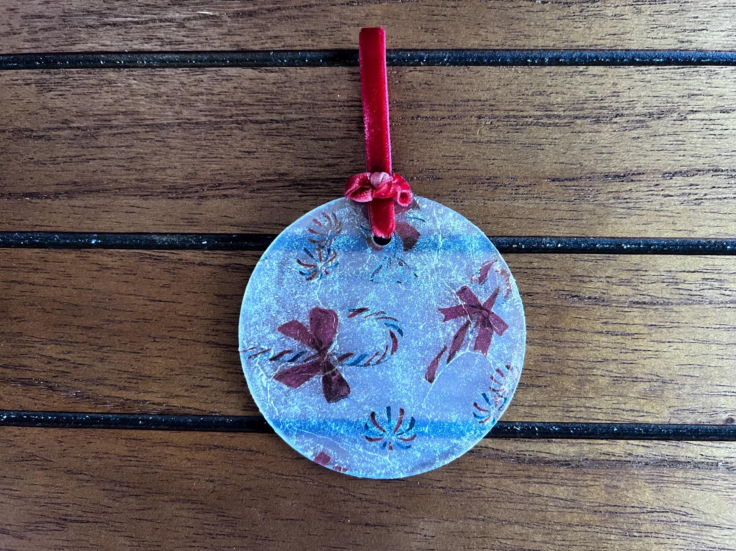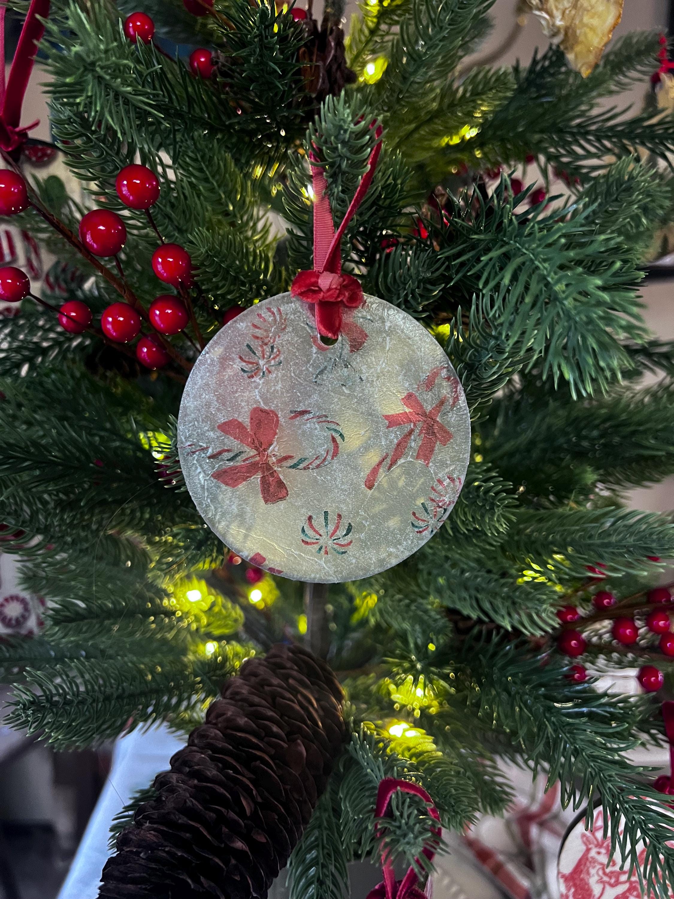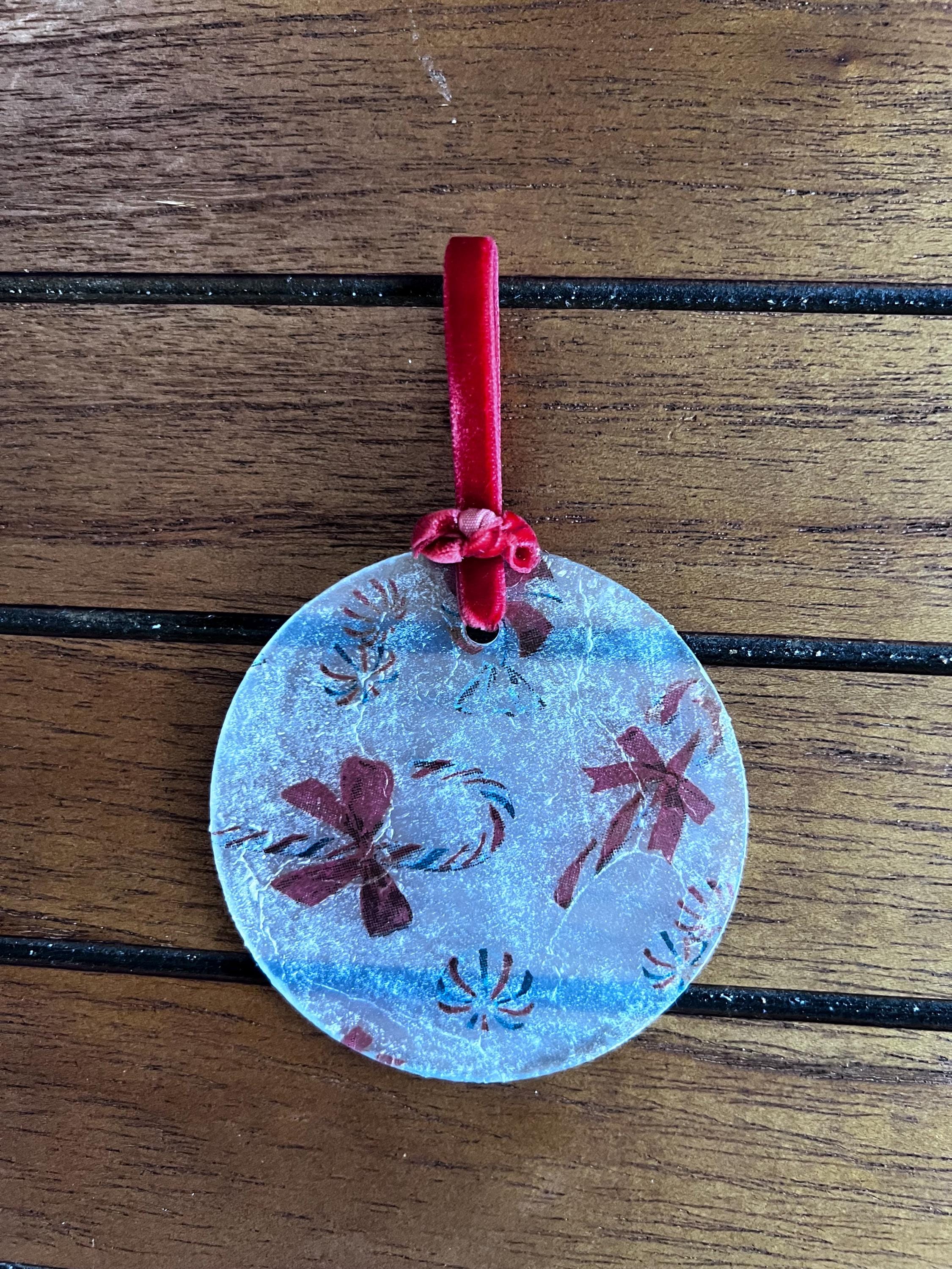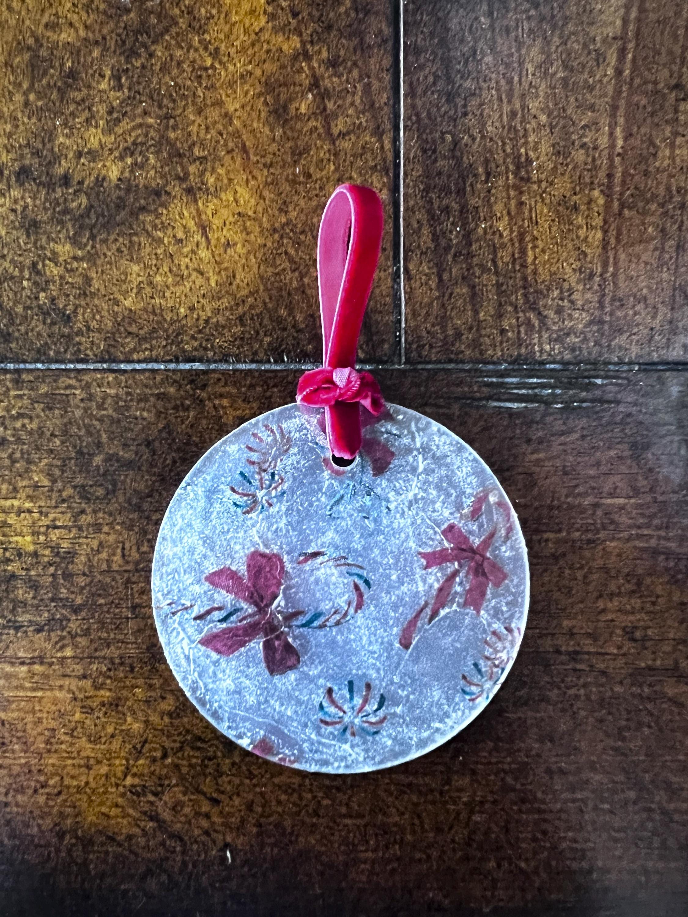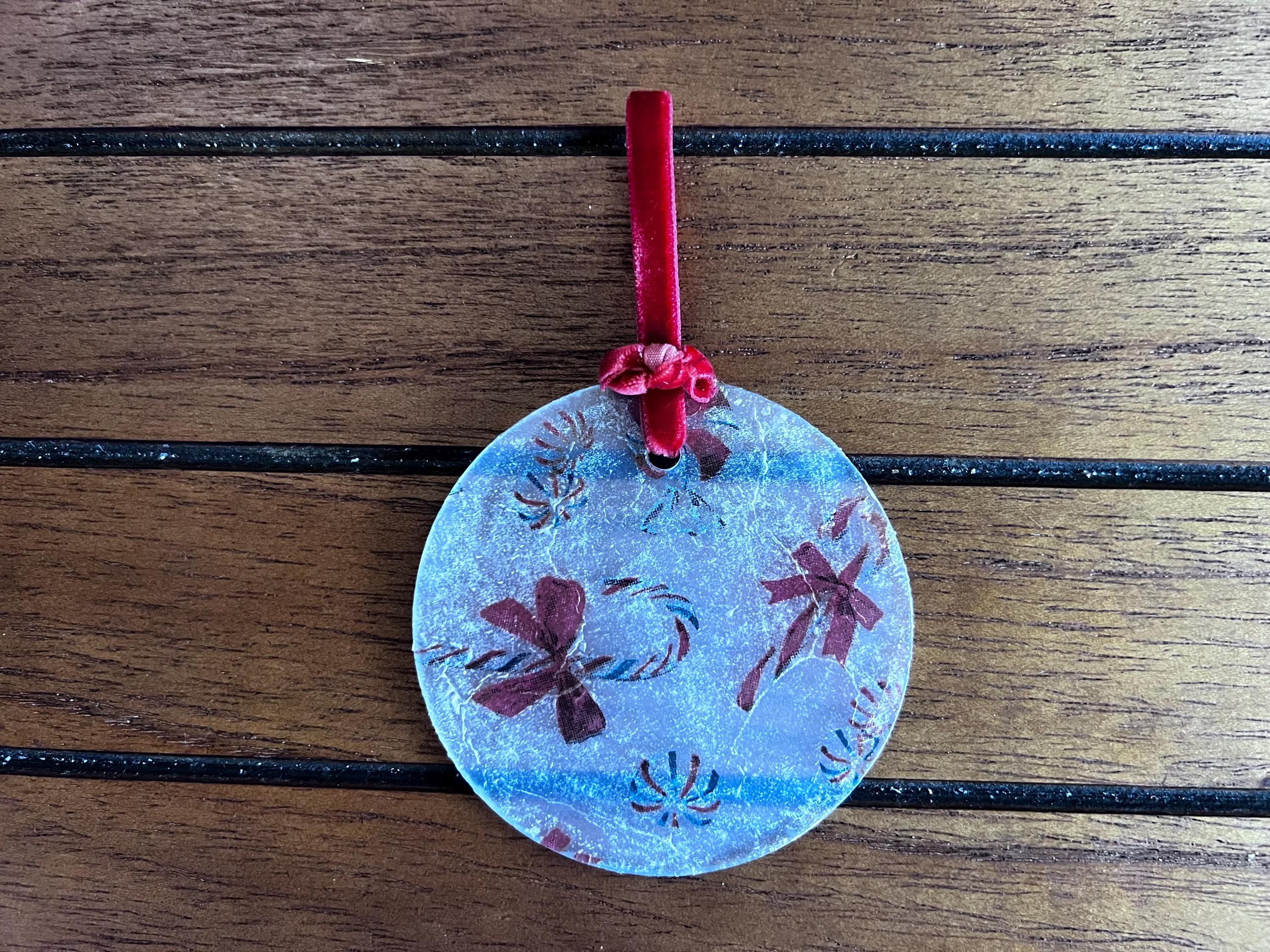 This ornament measures 2.5 inches in diameter and features a beautifully textured, frosted finish created by the layered decoupage process. The result is a charming, vintage-inspired surface that diffuses twinkling tree lights and gives the ornament a soft, sugared-glass appearance—like a frosty windowpane or confectioner’s dusting of powdered sugar.