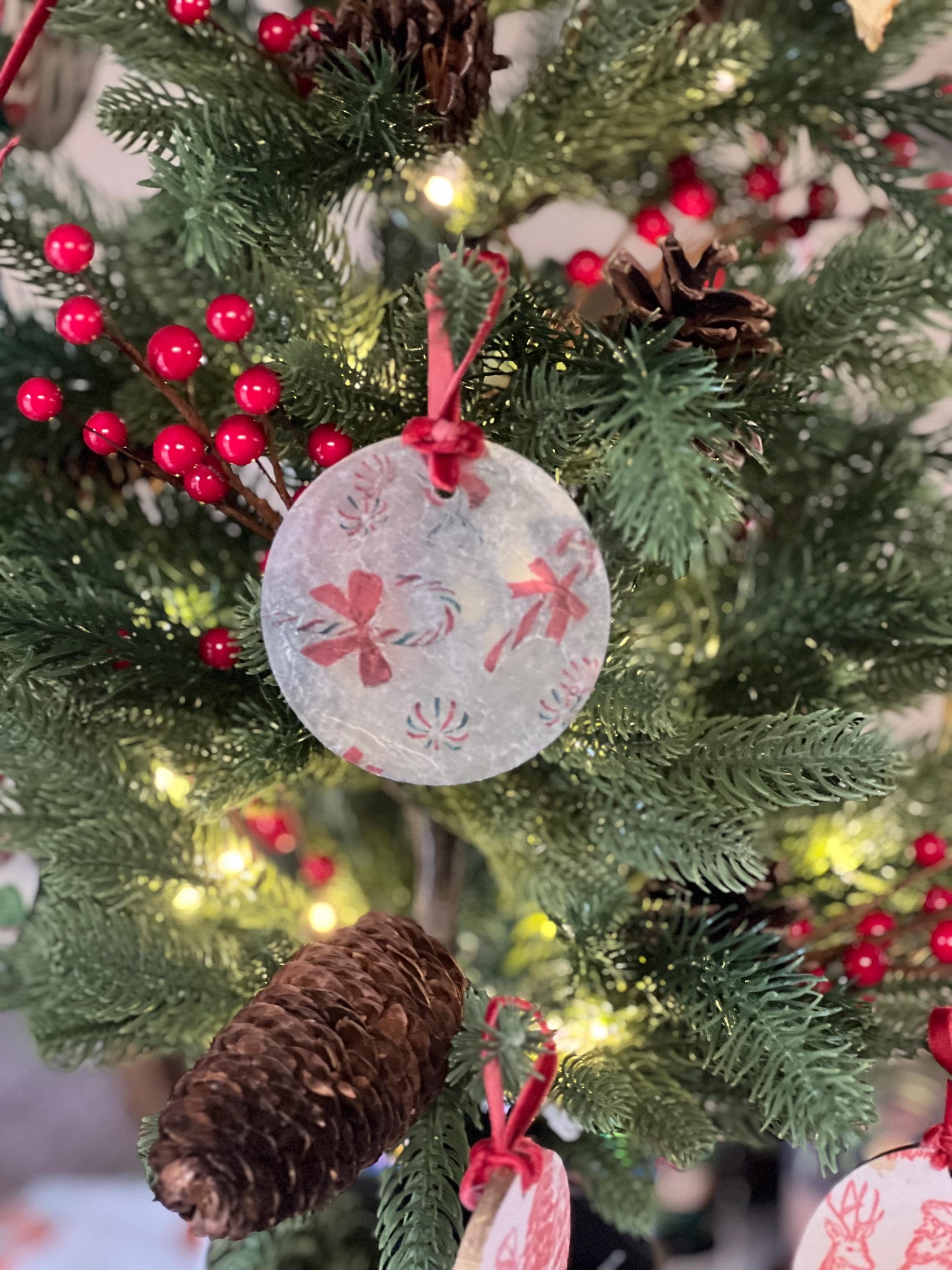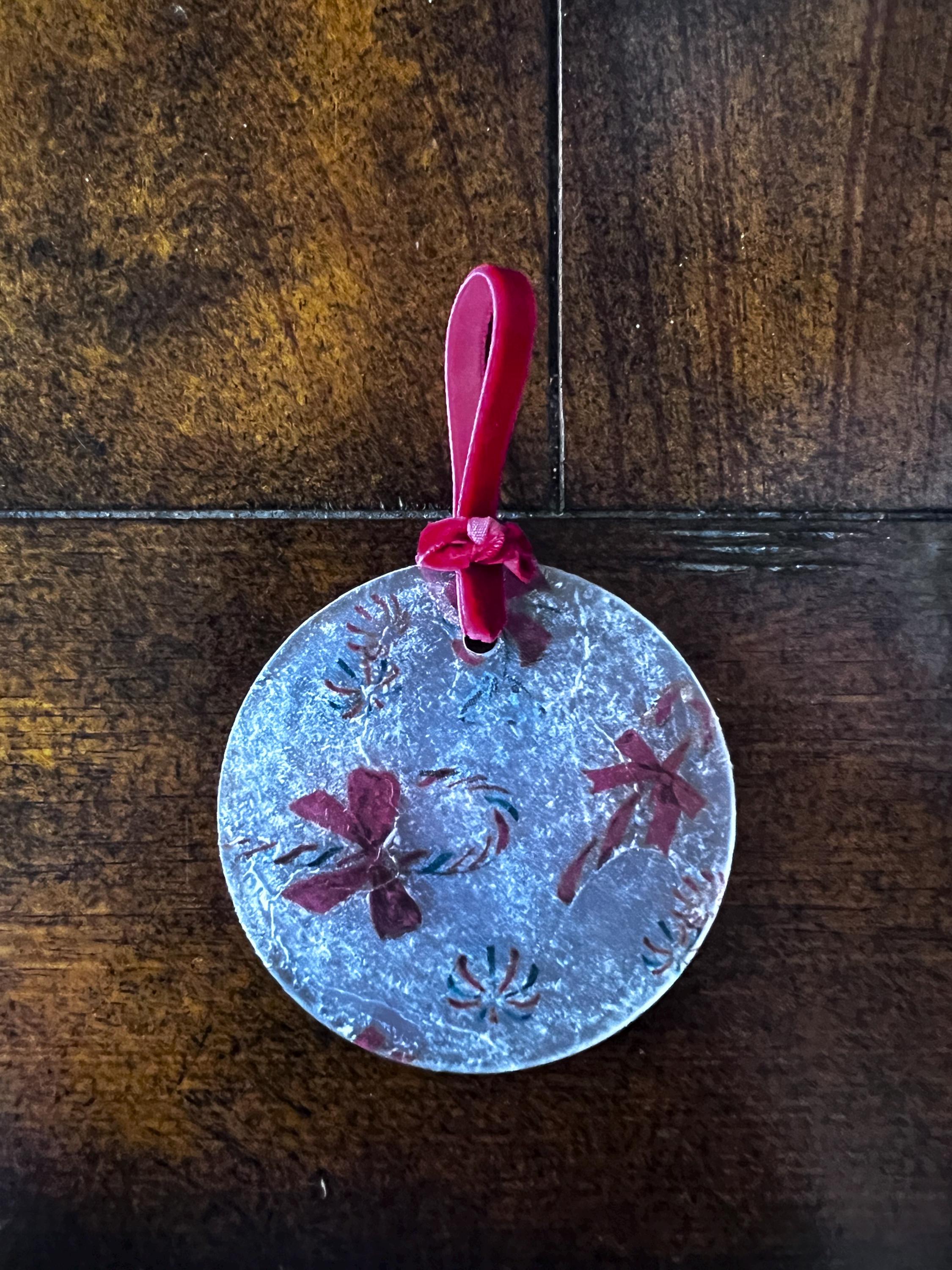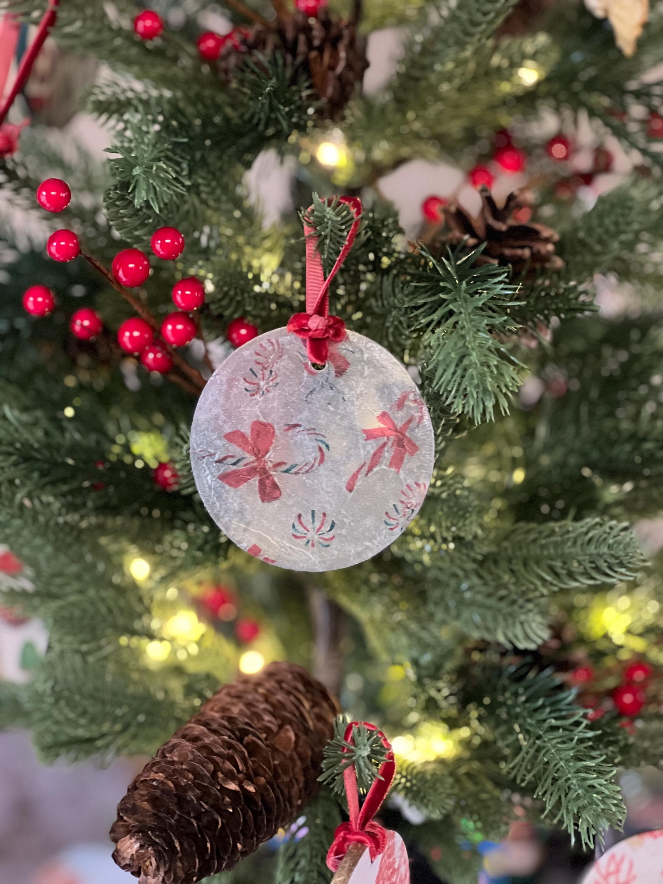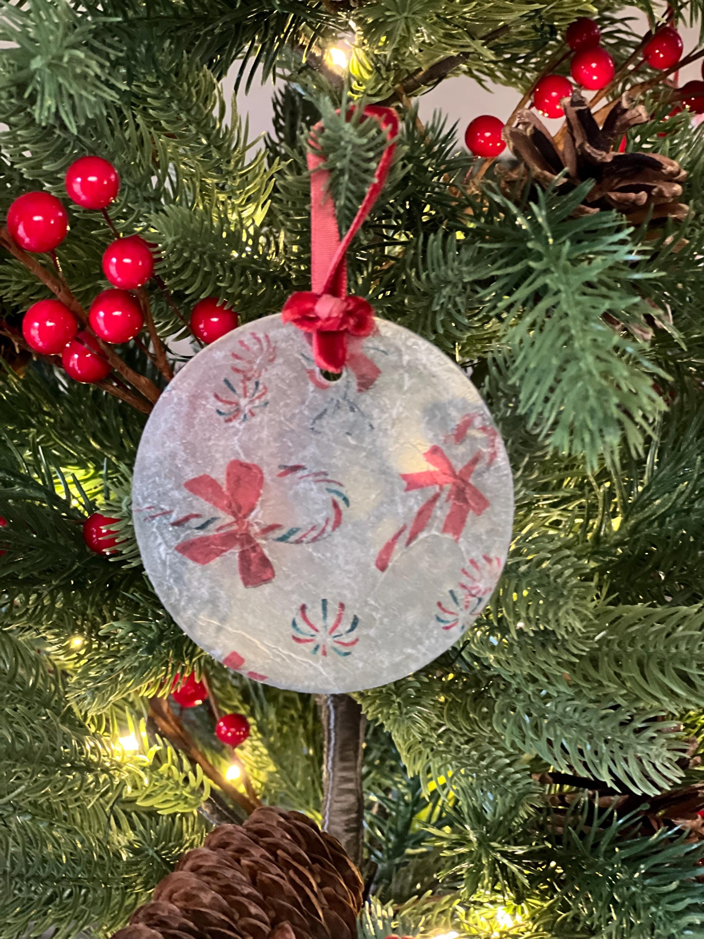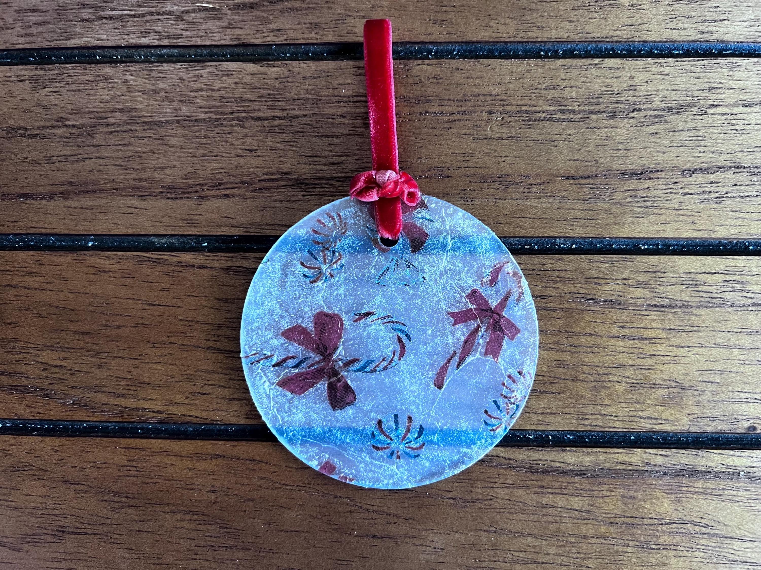 This ornament measures 2.5 inches in diameter and features a beautifully textured, frosted finish created by the layered decoupage process. The result is a charming, vintage-inspired surface that diffuses twinkling tree lights and gives the ornament a soft, sugared-glass appearance—like a frosty windowpane or confectioner’s dusting of powdered sugar.