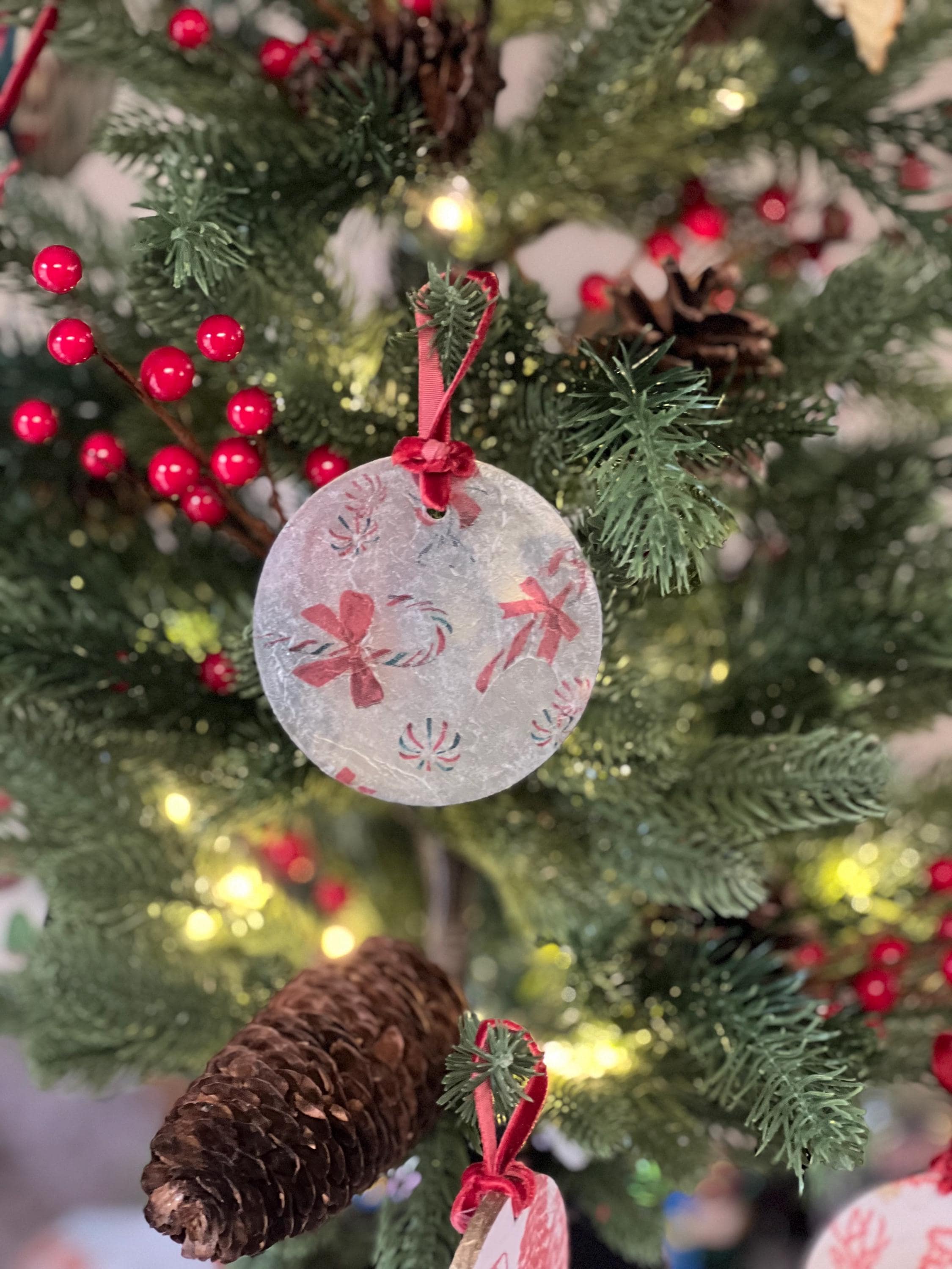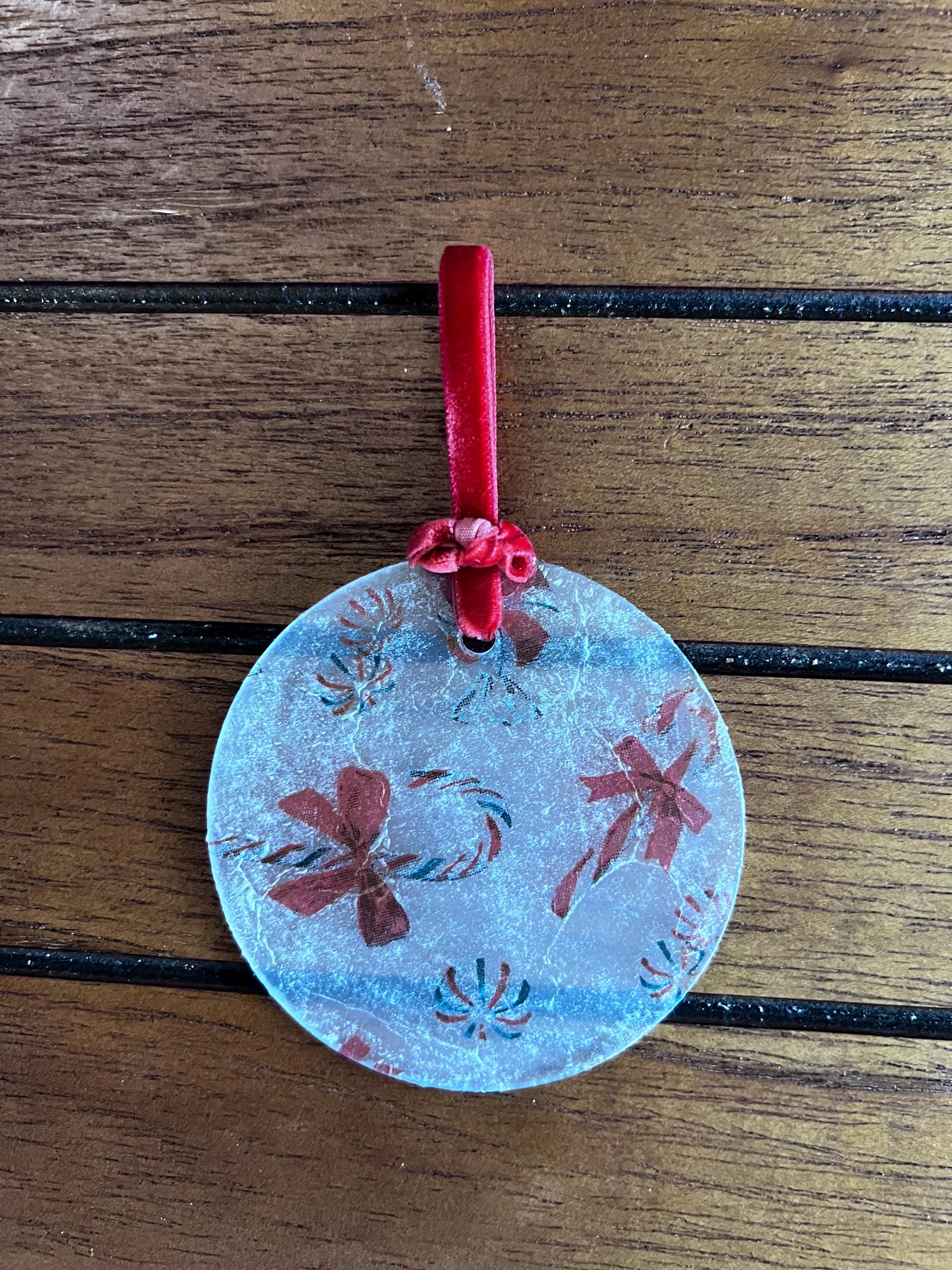 Features • Frosted glass ornament with candy cane & peppermint motif • Decoupaged and artistically finished for a sugared-glass texture • Elegant red velvet hanging ribbon • 2.5 inches in diameter • Weighs approx. 1.25 oz — solid and heirloom-quality • Artisan-made and one-of-a-kind