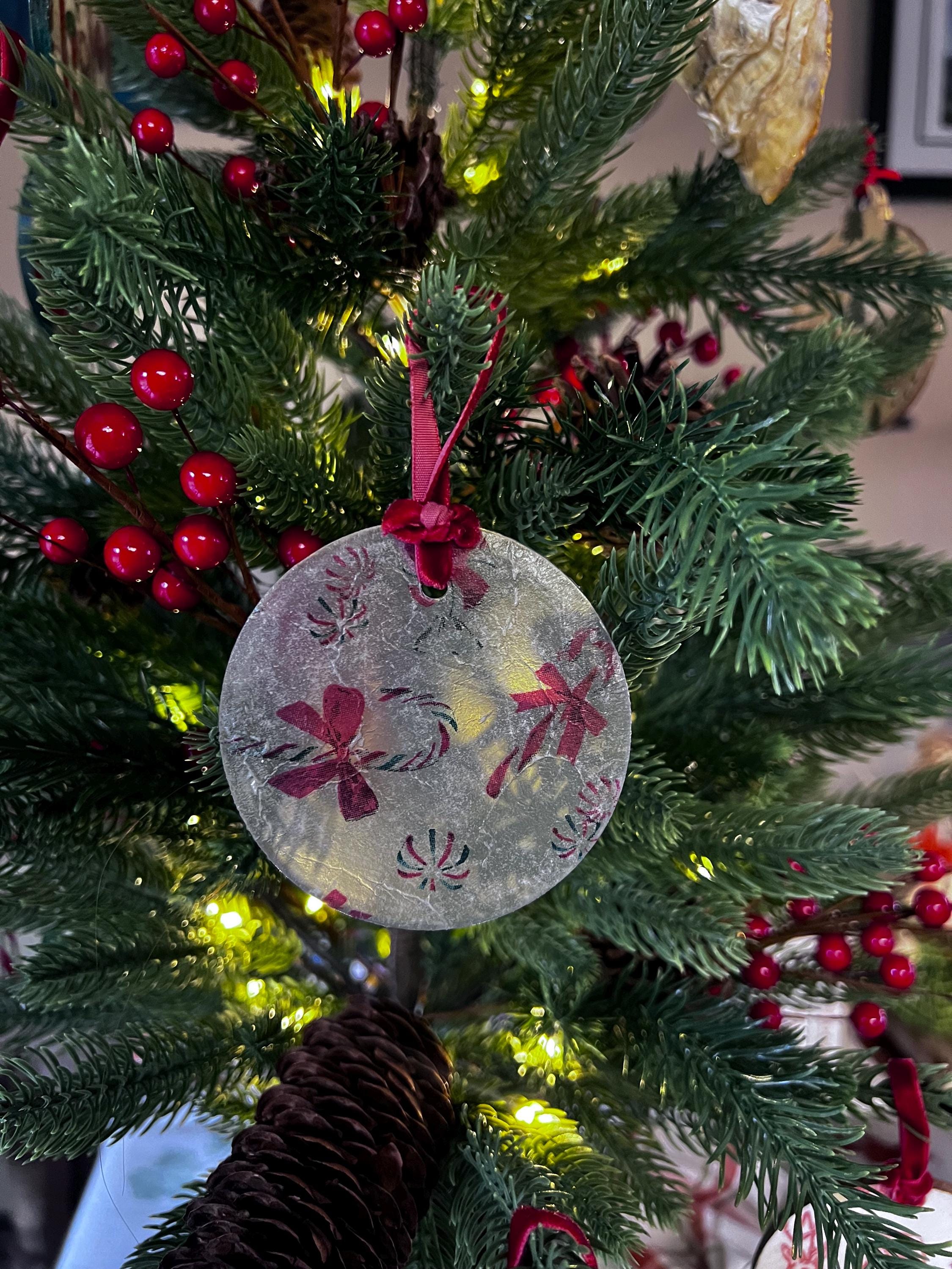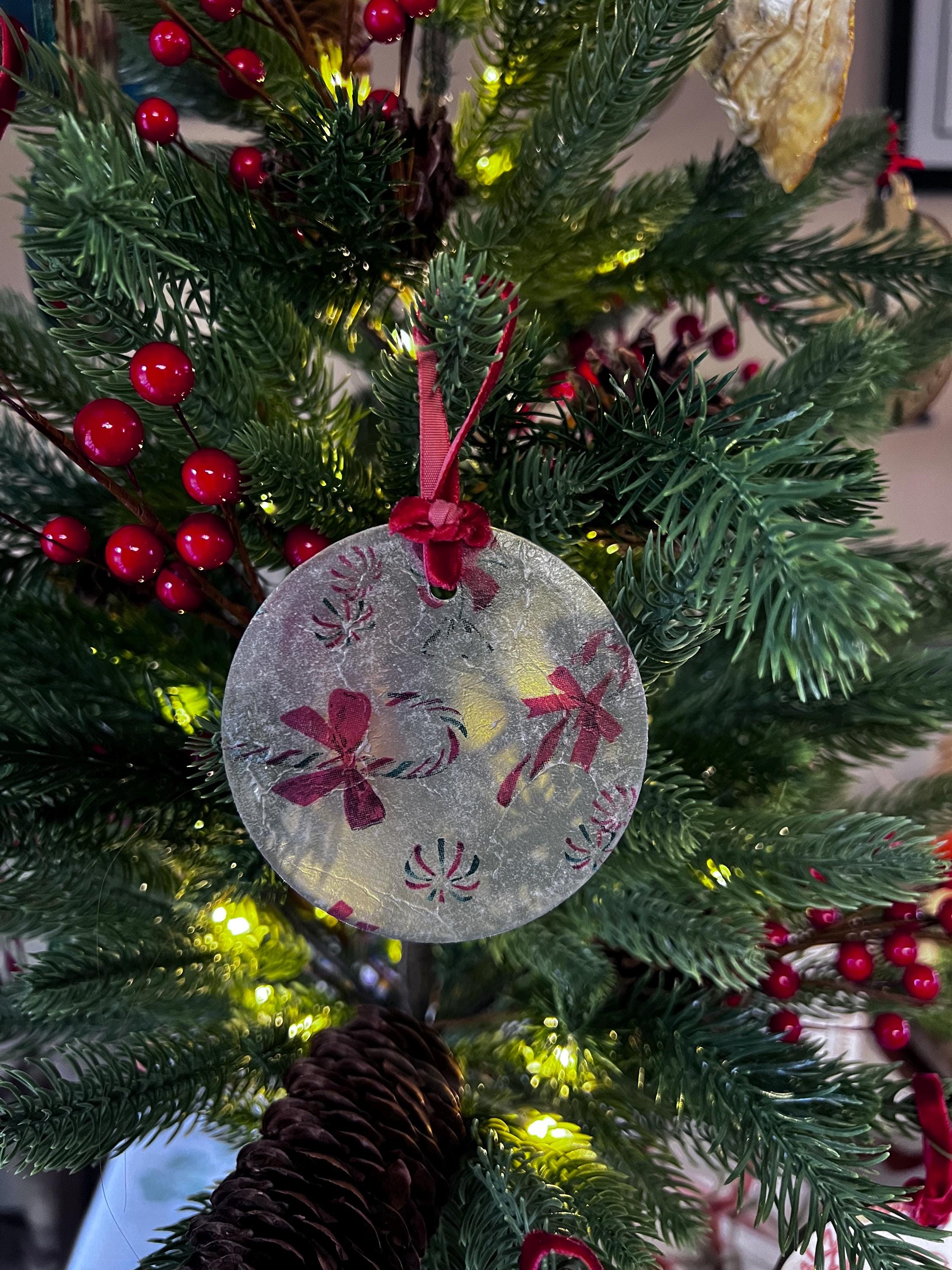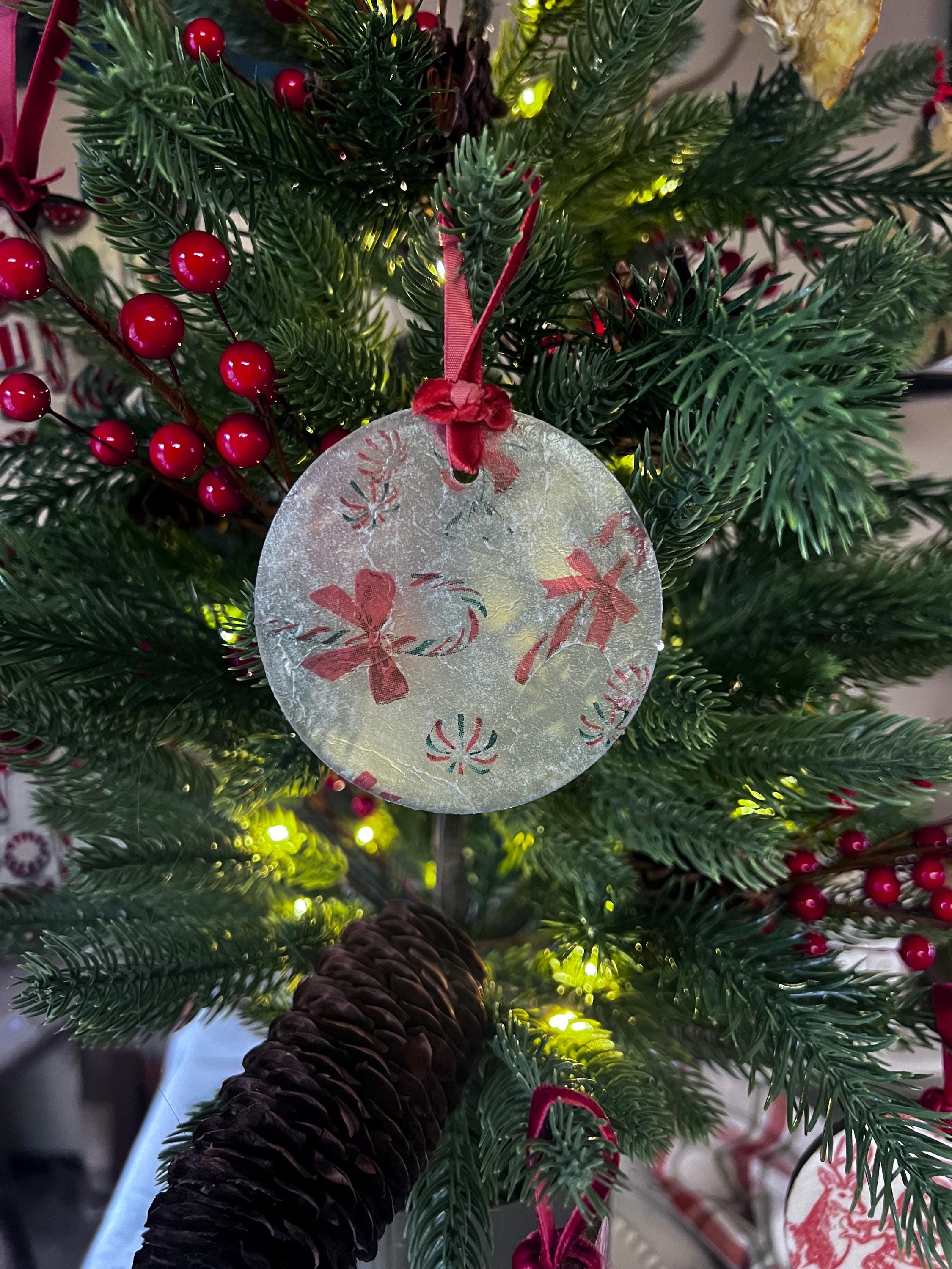 Bring nostalgic sweetness and artisan elegance to your Christmas décor with this Frosted Glass Candy Cane Ornament—a stunning glass piece delicately decoupaged with classic red-and-white candy canes and peppermint swirls.
